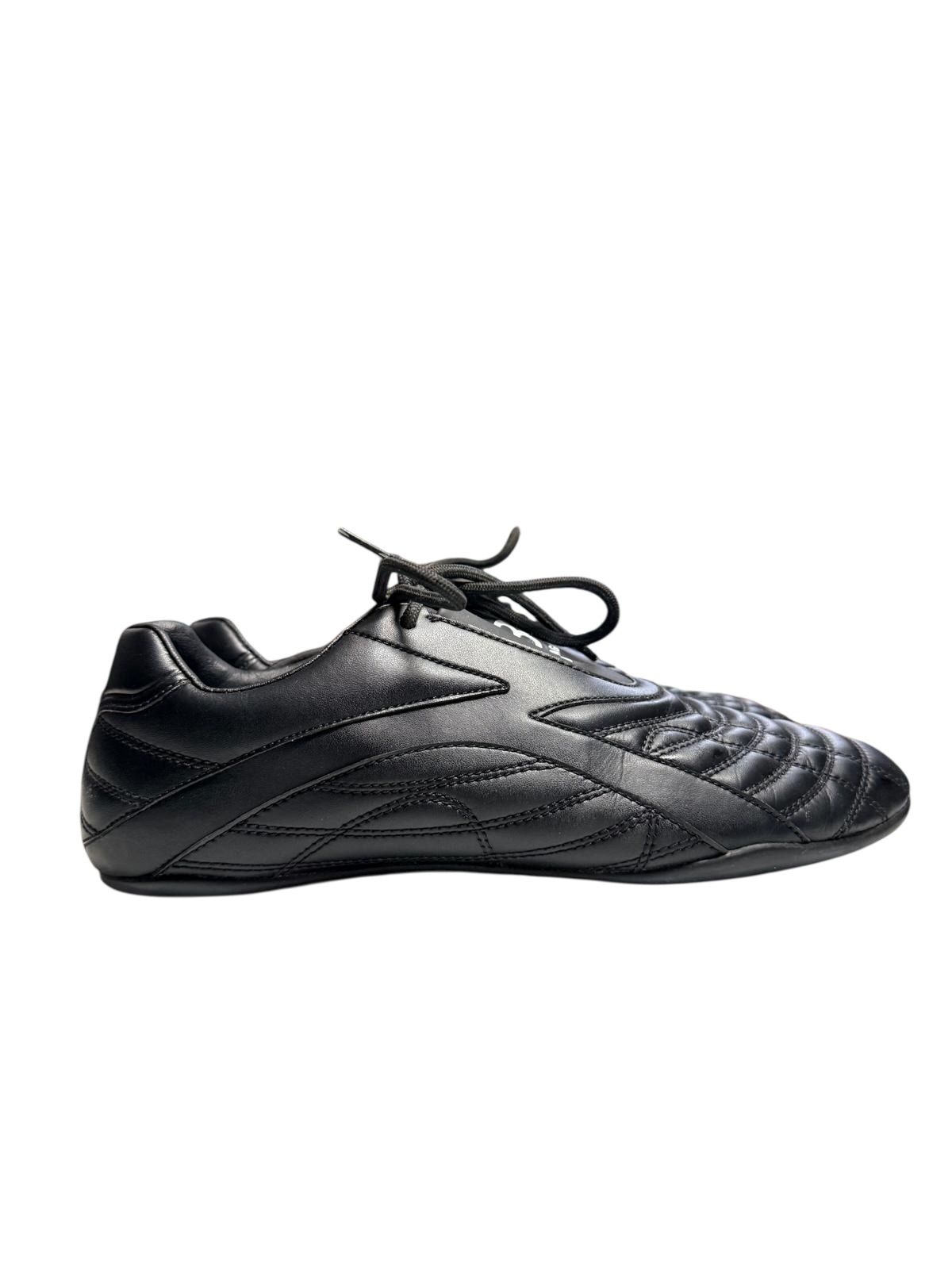 Le design se distingue par son empeigne matelassée à surpiqûres horizontales et son système de laçage dissimulé sous une languette protectrice. Le logo BB blanc contrastant est imprimé avec précision sur la languette et à l'arrière du talon, affirmant l'identité visuelle de Balenciaga. Montées sur une semelle en gomme fine et souple, ces chaussures offrent un confort "seconde peau" et une élégance technique, parfaites pour un look urbain discret et moderne.