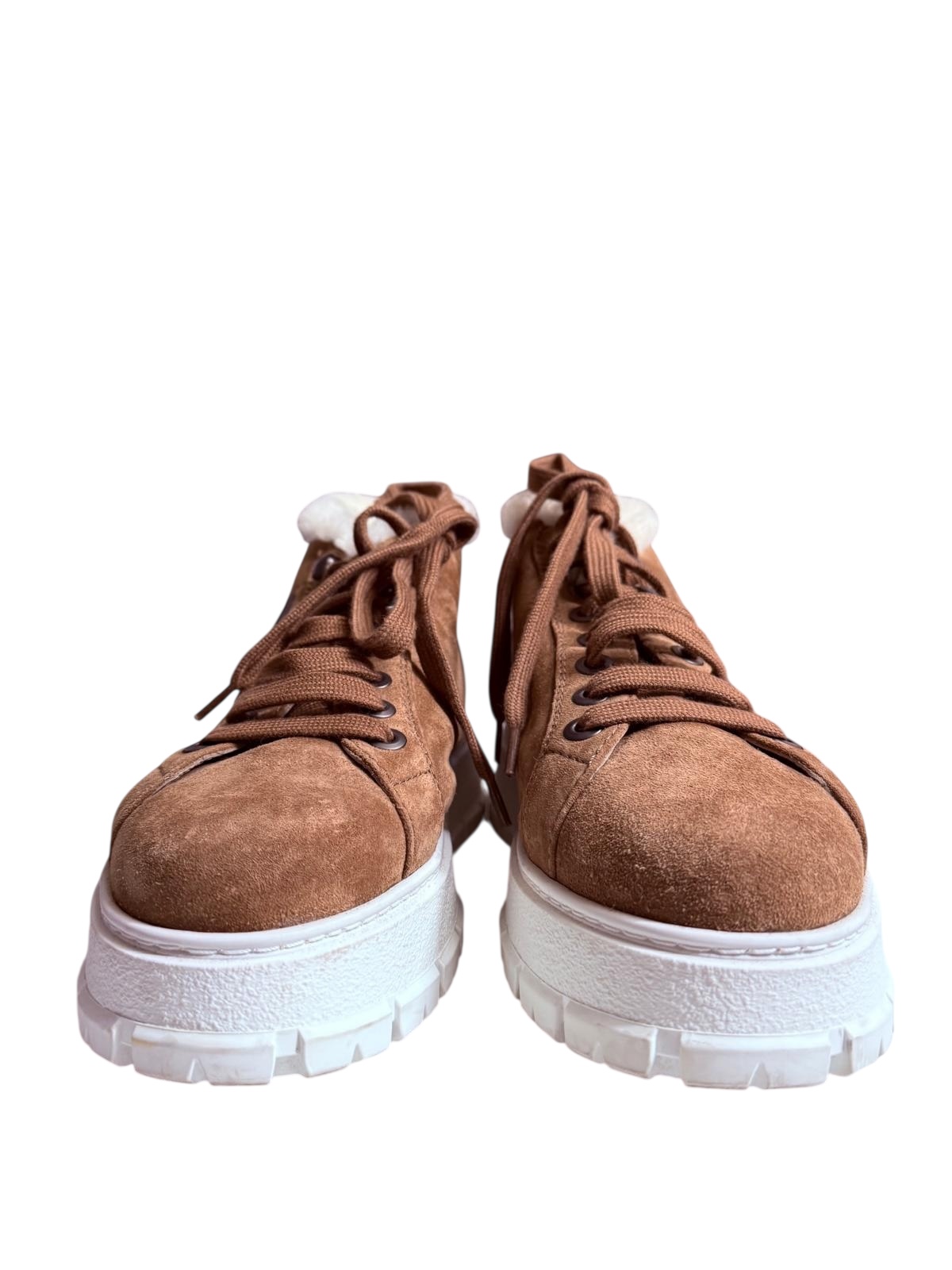 Ces baskets Prada sont l'alliance parfaite du confort hivernal et du luxe contemporain. Elles sont confectionnées dans un daim de haute qualité de couleur camel, offrant une texture douce et chaleureuse.