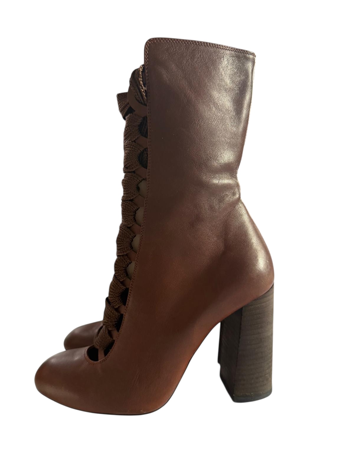 Exprimez votre féminité avec ces superbes bottines signées Chloé. Confectionnées en cuir souple marron, elles se distinguent par ses lacets à l'avant qui leur confère un charme romantique et bohème. Elles présentent une silhouette classique et intemporelle avec un bout arrondi. Le talon bloc, stable et confortable, est également gainé de cuir pour une finition impeccable. Ces bottines sont parfaites pour apporter une touche de douceur à vos tenues.