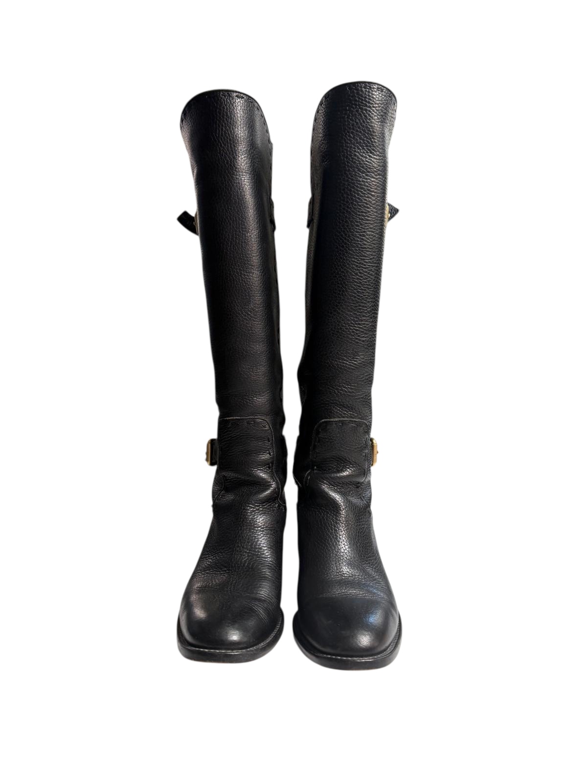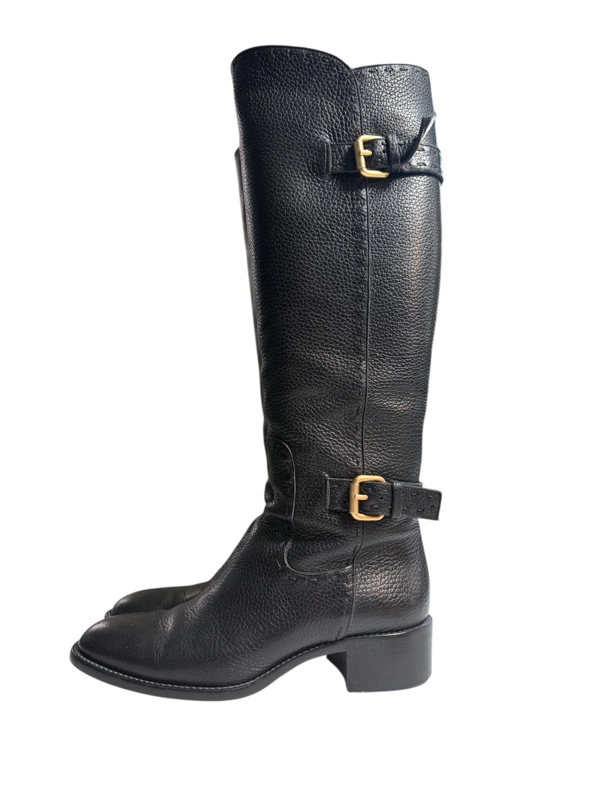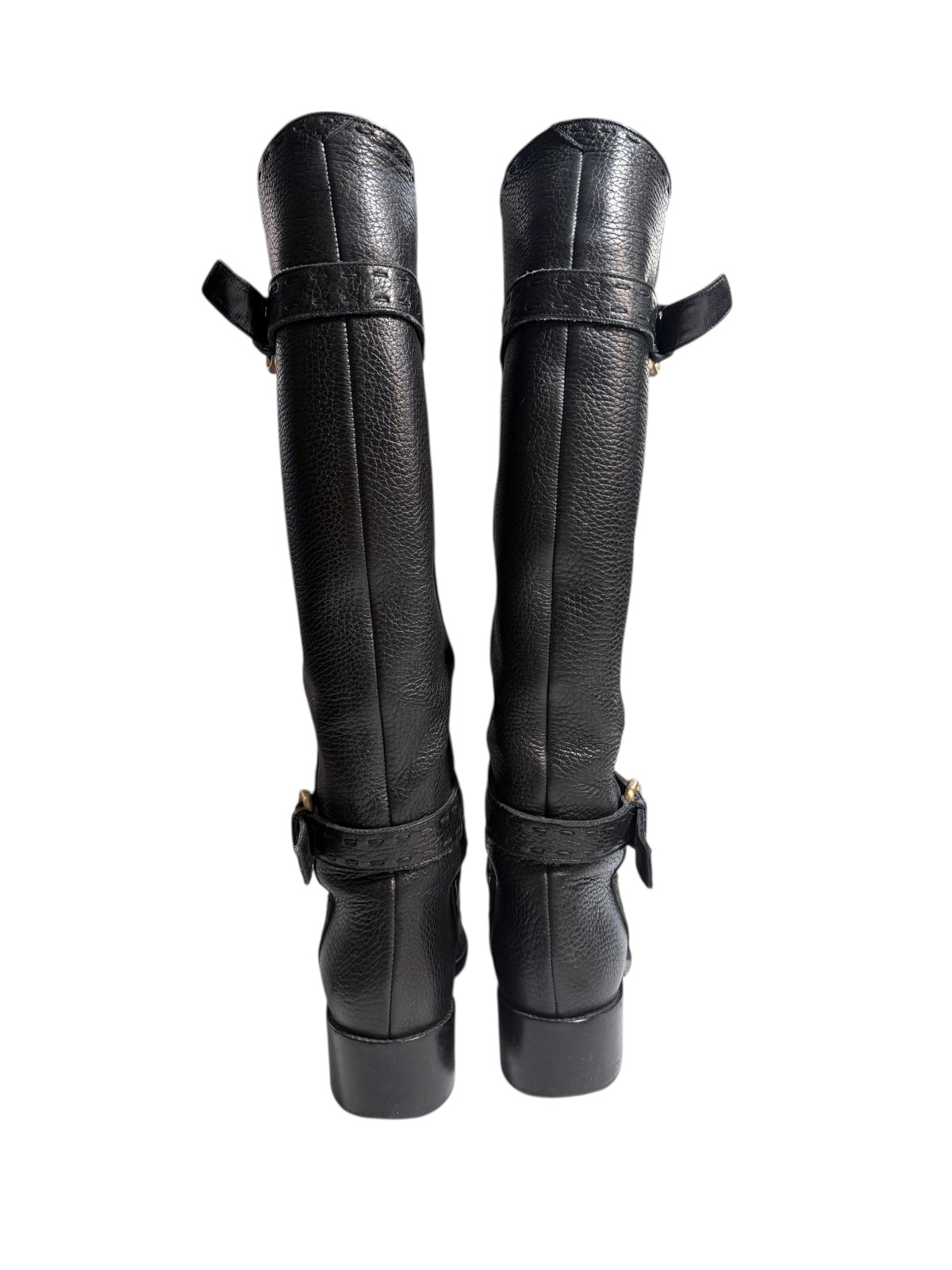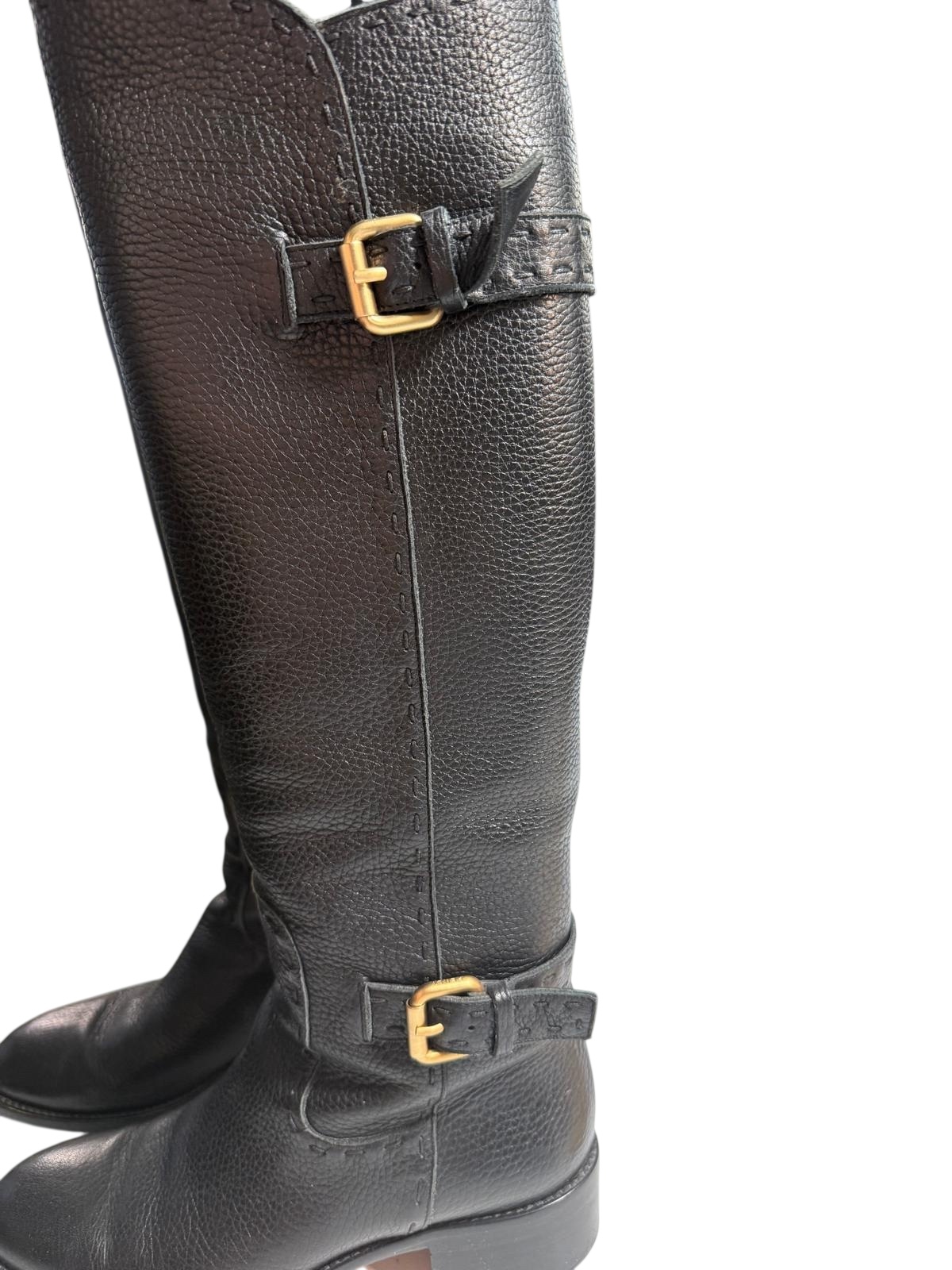 Incarnez une élégance équestre intemporelle avec ces superbes bottes Fendi, un classique absolu du vestiaire féminin. Confectionnées en Italie dans un luxueux cuir de veau grainé noir, elles sont à la fois souples et résistantes. Leur silhouette haute et épurée épouse la jambe pour une allure flatteuse, tandis que leur petit talon bottier assure un confort optimal tout au long de la journée. Le design est rehaussé de deux sangles ajustables à boucles en métal finition dorée, une à la cheville et une en haut de la tige, ajoutant une touche de raffinement et un clin d'œil au monde équestre. Des bottes d'une qualité exceptionnelle, parfaites sur un jean skinny ou avec une jupe, qui traverseront les saisons avec style.