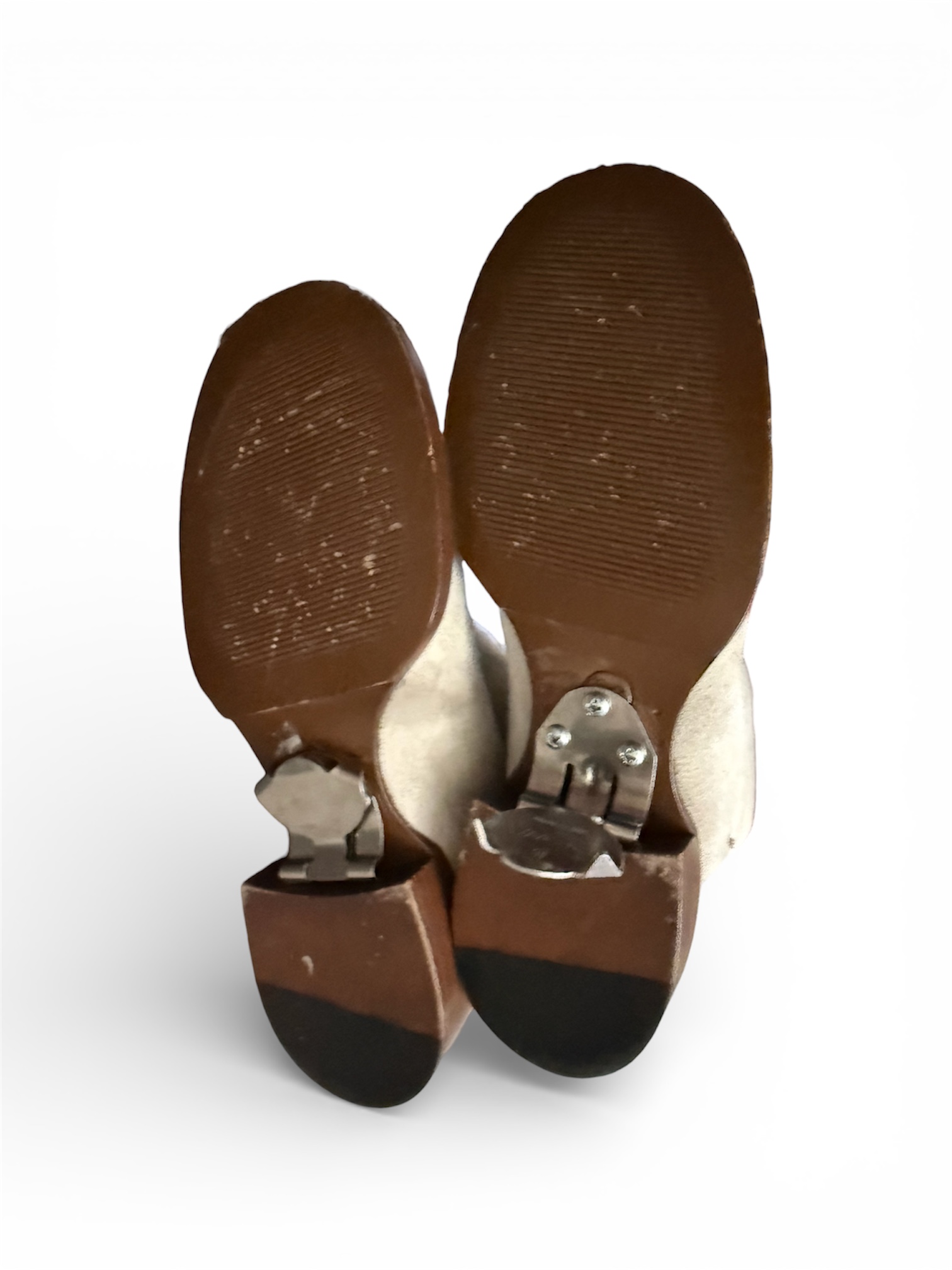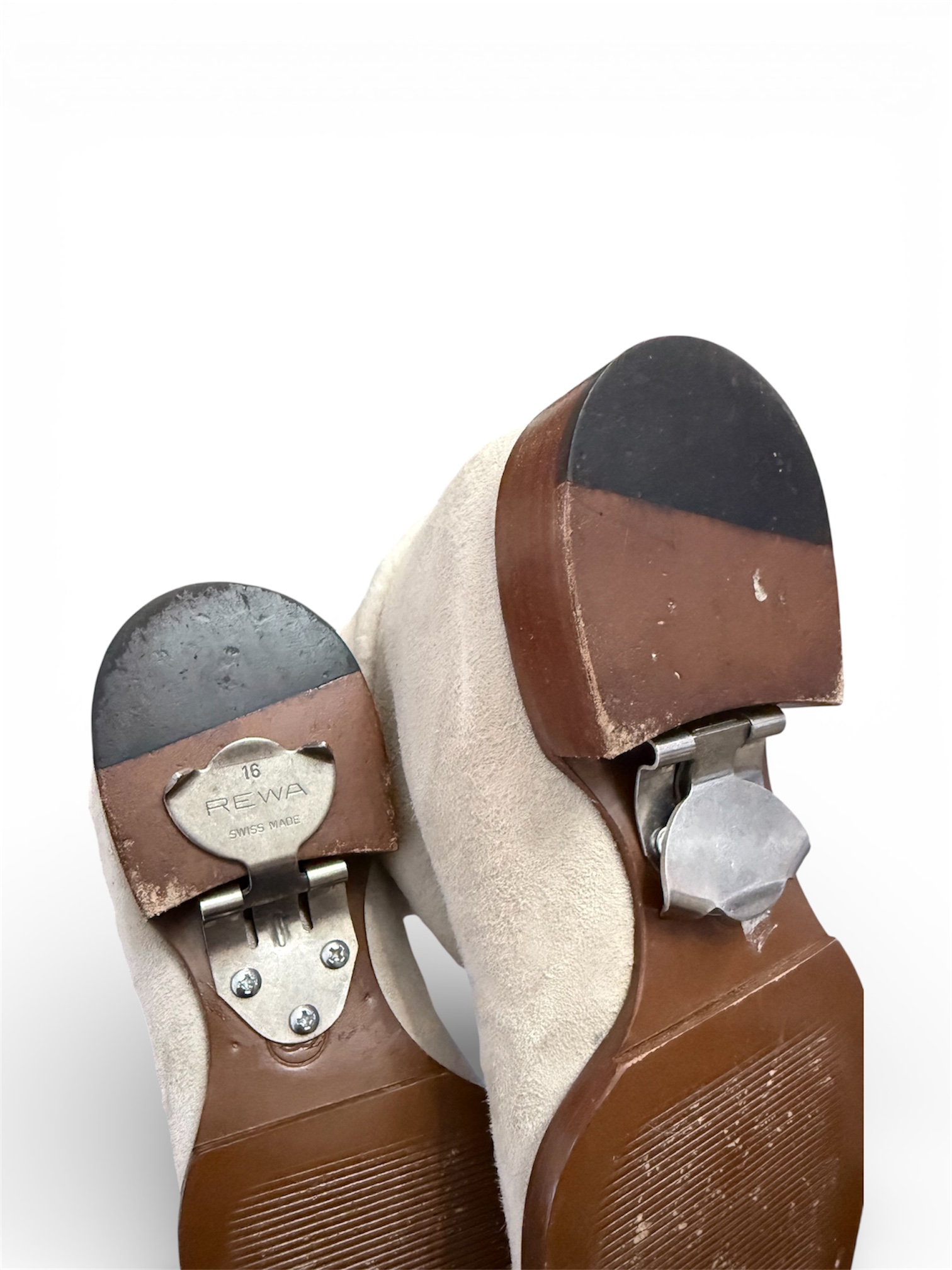 À noter que la cliente a fait installer des crampons métalliques sous les semelles, visibles sur les photos, afin d’améliorer l’adhérence lors des déplacements sur des surfaces glissantes.
