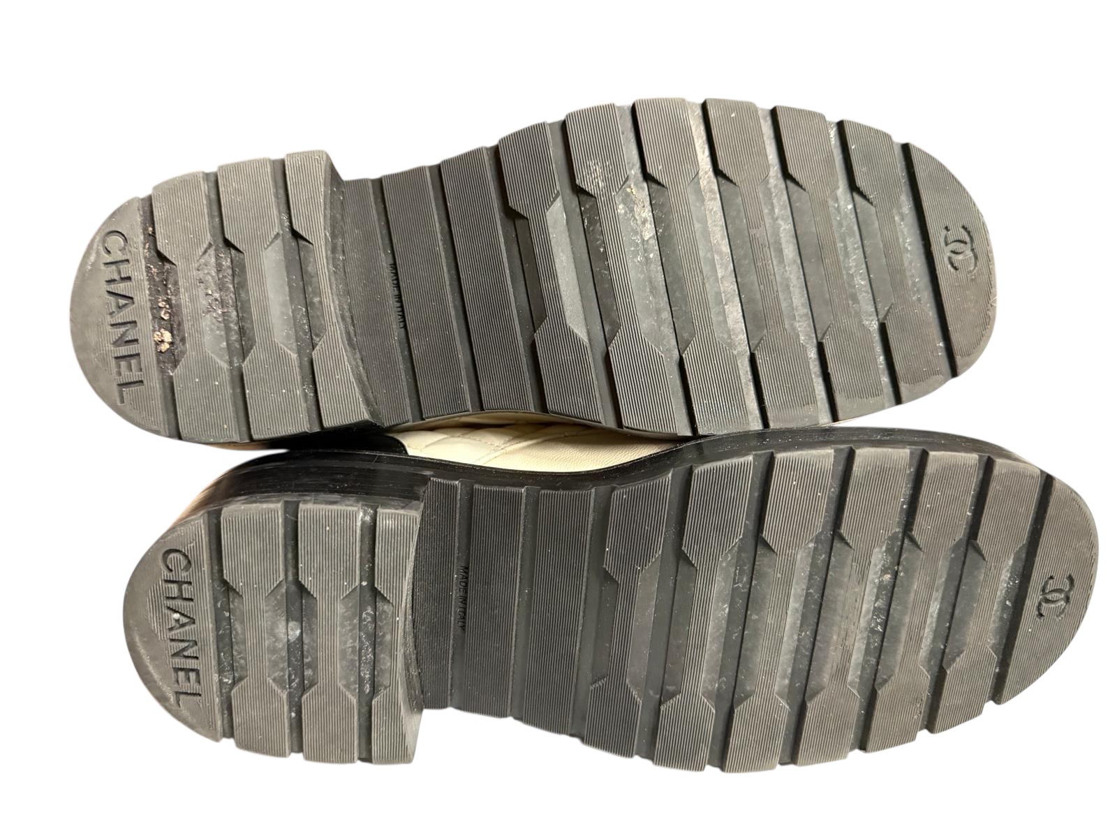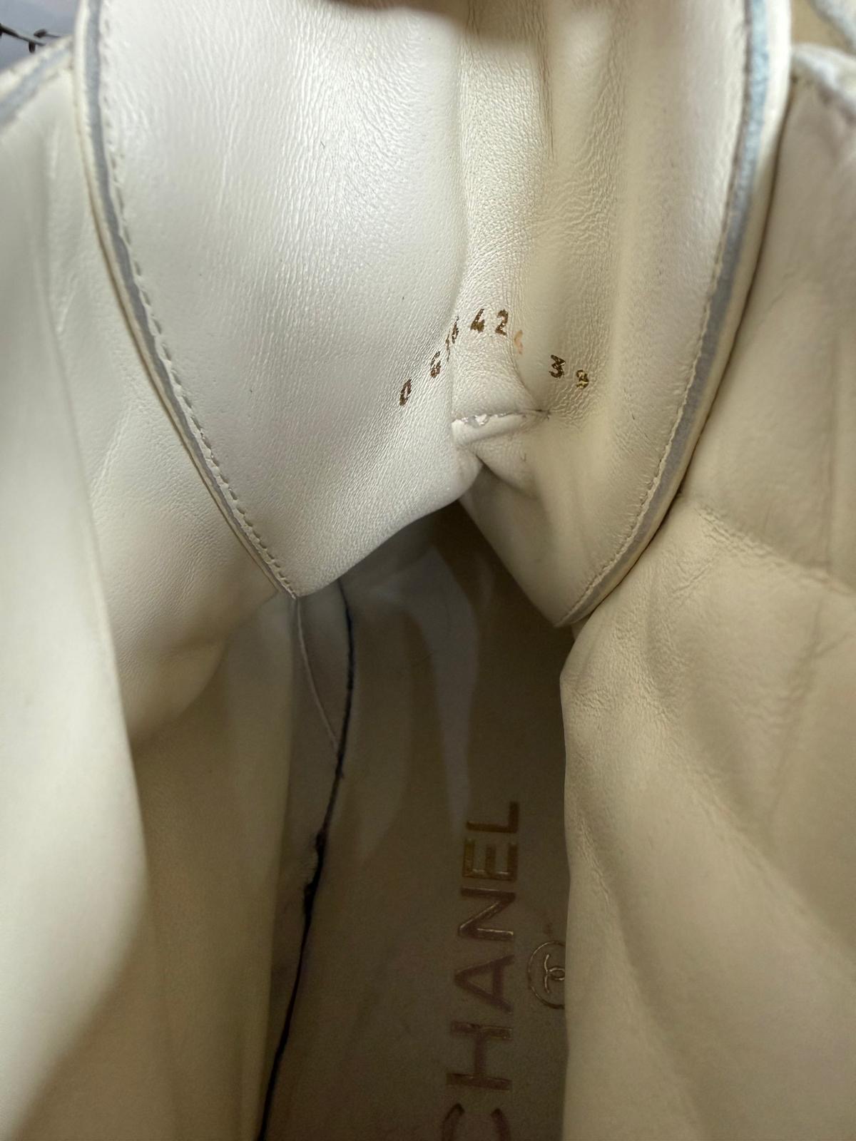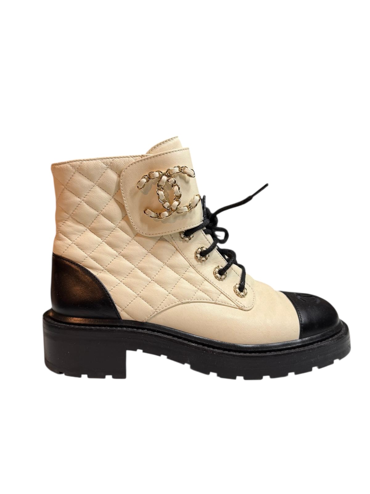 Ces bottines Chanel sont une fusion audacieuse entre l'esthétique utilitaire et les codes de haute couture de la Maison. Elles sont confectionnées en cuir d'agneau souple blanc écru, arborant le célèbre matelassage en losanges sur la tige, contrasté par un bout arrondi et un contrefort en cuir lisse noir.