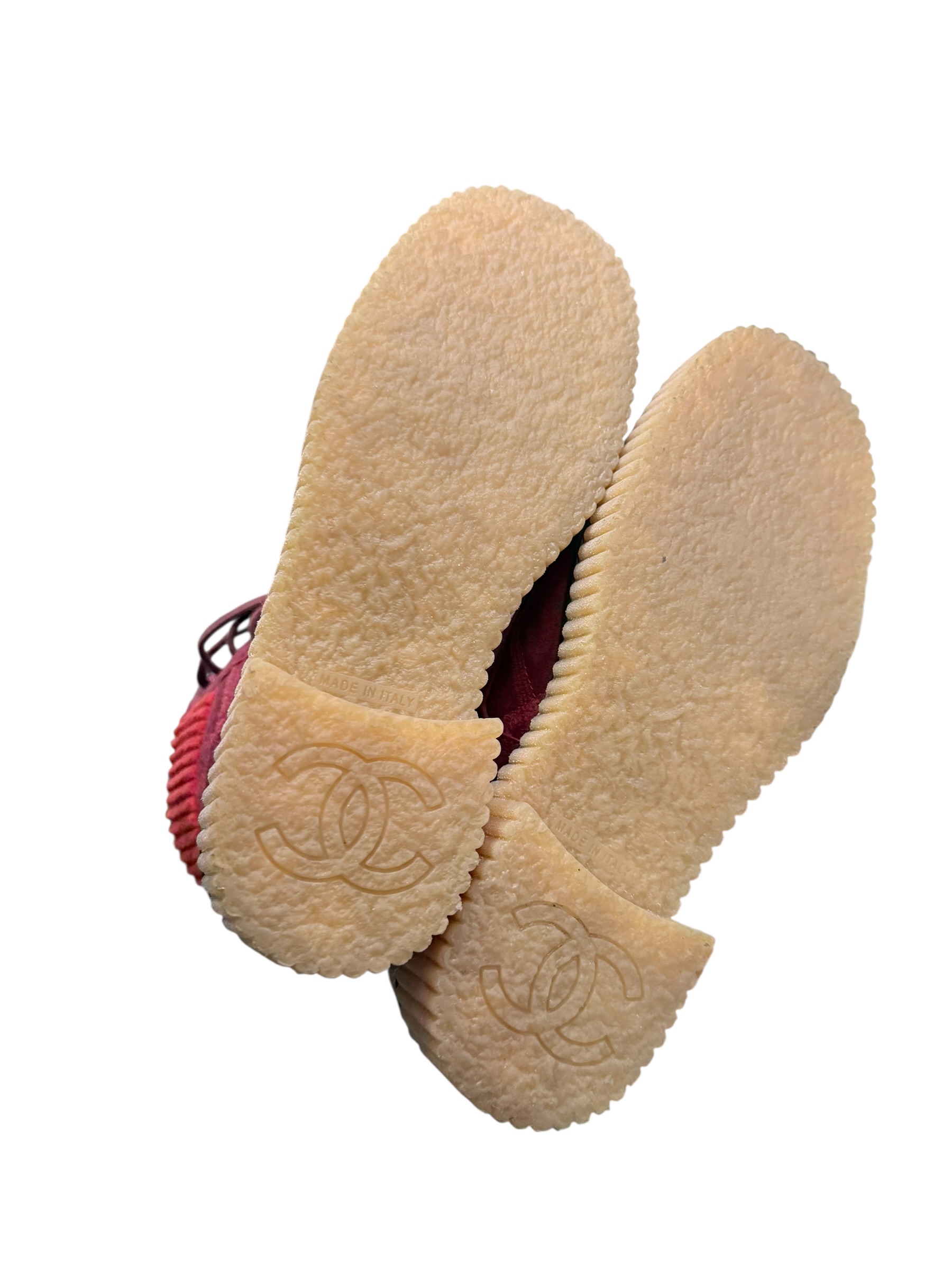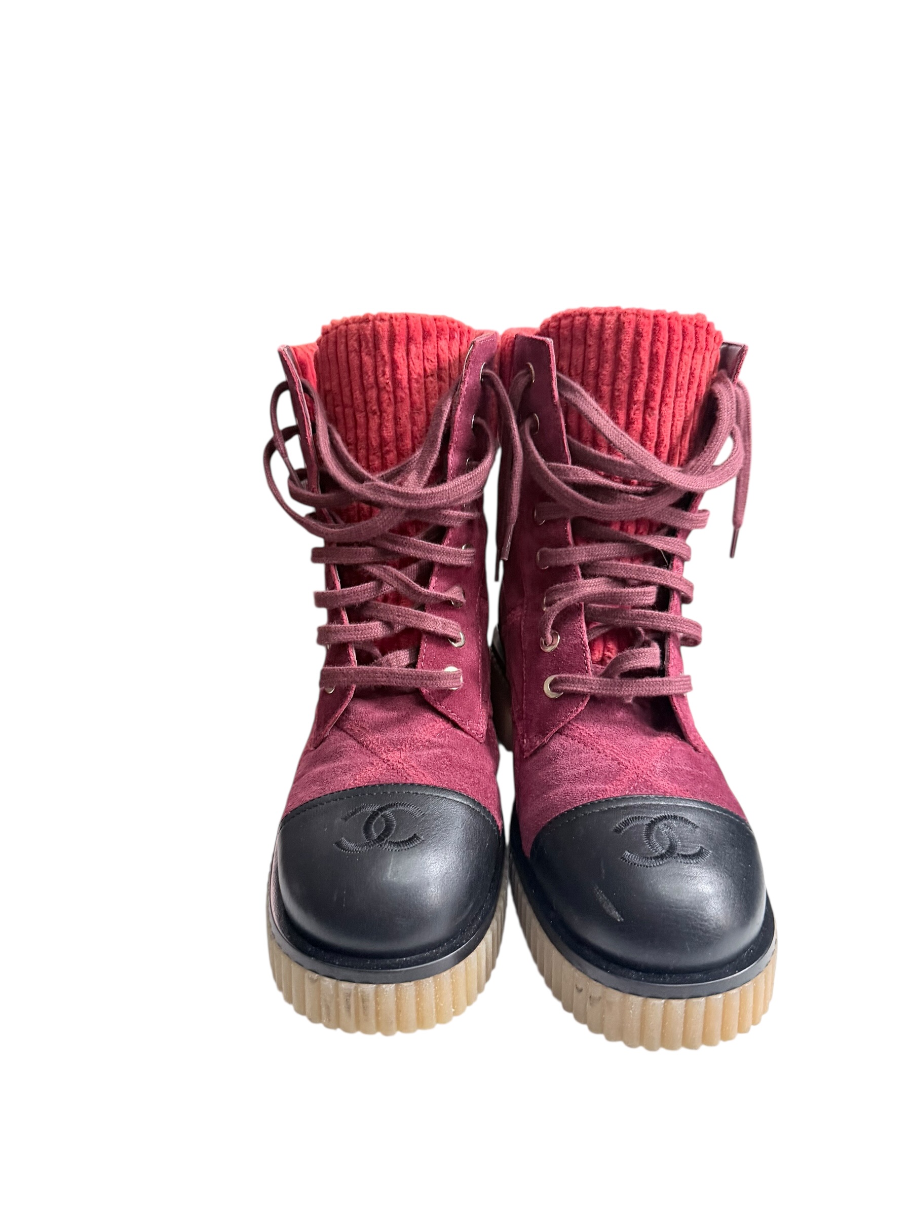Ces bottines Chanel sont l'incarnation parfaite du luxe utilitaire, mélangeant robustesse et détails raffinés. Elles sont confectionnées dans un daim bordeaux profond, sublimé par des surpiqûres en forme de losanges, rappelant le code iconique de la Maison.