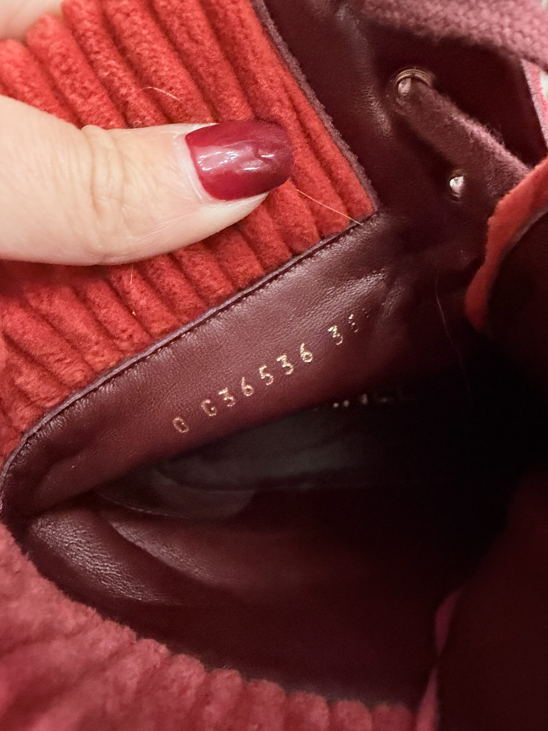 Le design se distingue par son contraste de matières : le bout et le talon sont renforcés en cuir lisse noir, avec le logo double C embossé discrètement sur l'avant. Un col en maille côtelée rouge vif apporte une touche de confort et de chaleur, tout en créant un contraste chromatique audacieux. Montées sur une semelle crantée en gomme beige pour une adhérence parfaite, ces bottines sont idéales pour affronter l'hiver avec une élégance résolument moderne.