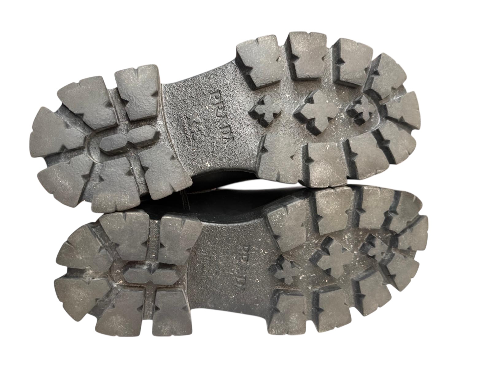 Les empiècements élastiqués latéraux permettent un enfilage facile tout en conservant l’esthétique classique des bottines Chelsea. À la fois fonctionnelles et résolument contemporaines, ces bottines Prada s’imposent comme une pièce forte du vestiaire urbain, capable d’apporter caractère et modernité à une silhouette du quotidien.