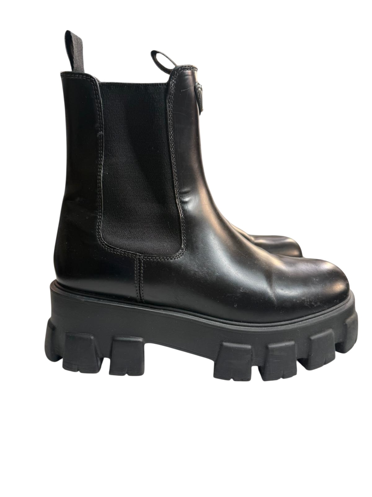 Ces bottines Prada de la ligne Monolith incarnent parfaitement l’esthétique contemporaine et affirmée de la maison italienne. Confectionnées en cuir noir brossé, une matière emblématique de Prada reconnue pour sa finition lisse et légèrement brillante, elles présentent une silhouette Chelsea épurée qui épouse élégamment la cheville.
