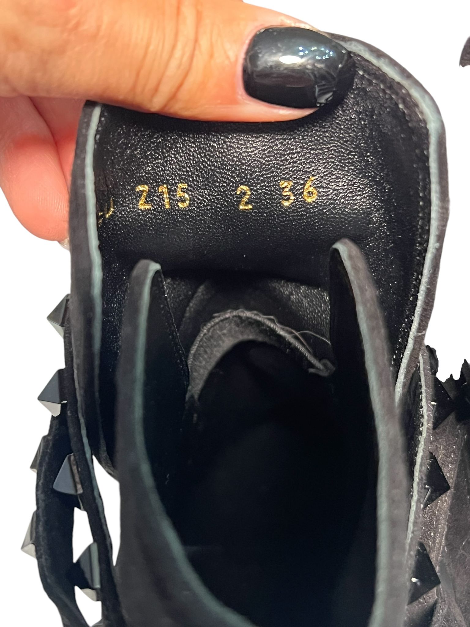 Ces bottines Valentino se distinguent par leur design à la fois élégant et rock. Elles sont en suède noir et ornées de deux brides de cheville cloutées, qui se croisent sur le devant. Ces bottines sont parfaites pour une soirée, un événement spécial ou pour apporter une touche de caractère à une tenue simple comme un jean skinny ou une jupe en cuir.