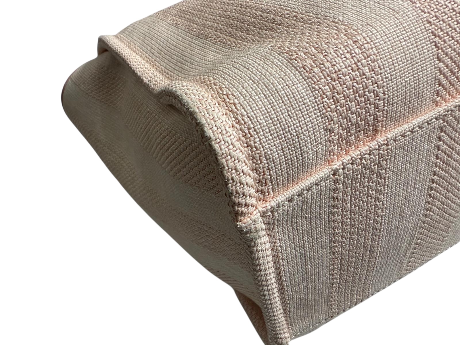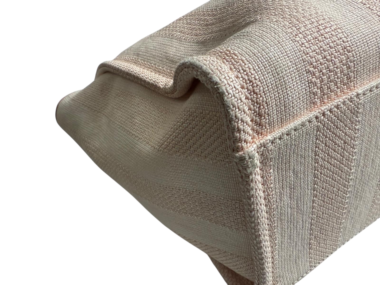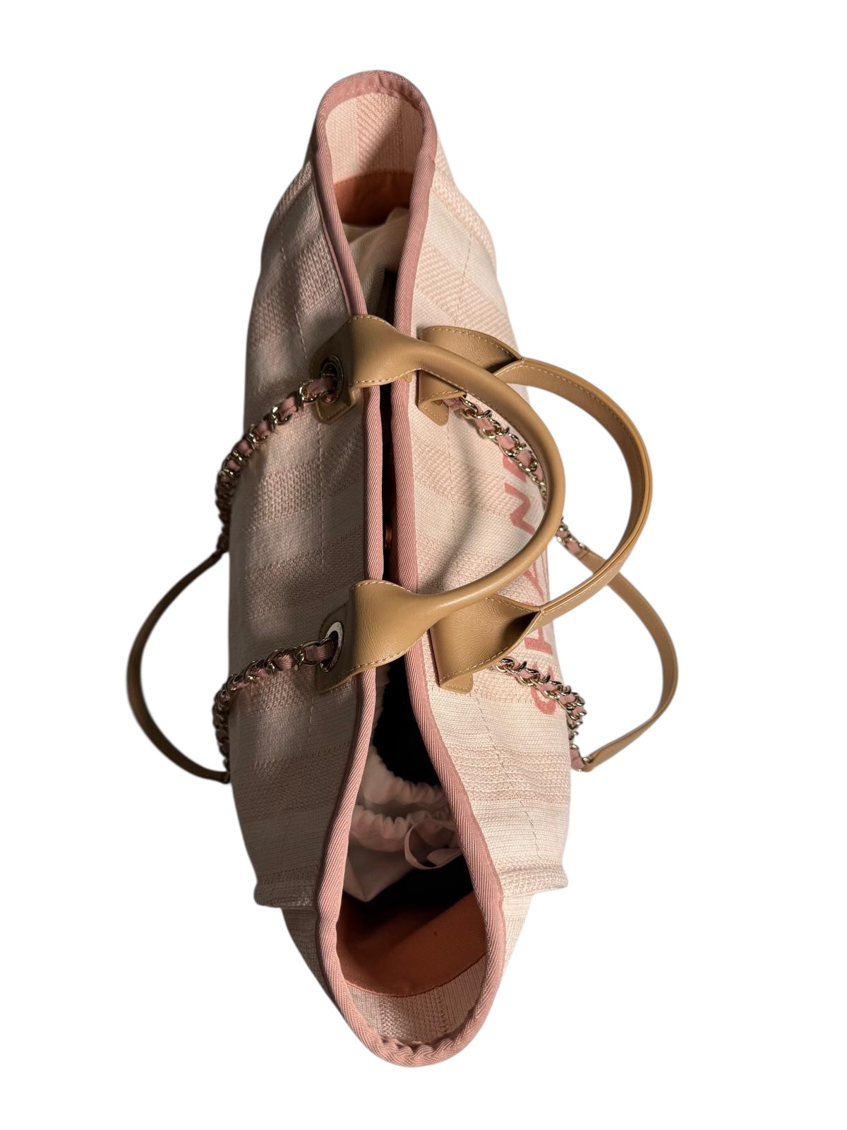 Le sac Cabas Deauville Chanel est devenu, depuis son lancement en 2012, l'accessoire incontournable pour une allure estivale chic et décontractée. Ce modèle "Large Shopping Bag" est confectionné dans une toile de raphia tissée aux rayures verticales subtiles dans les tons beige et rose dragée.