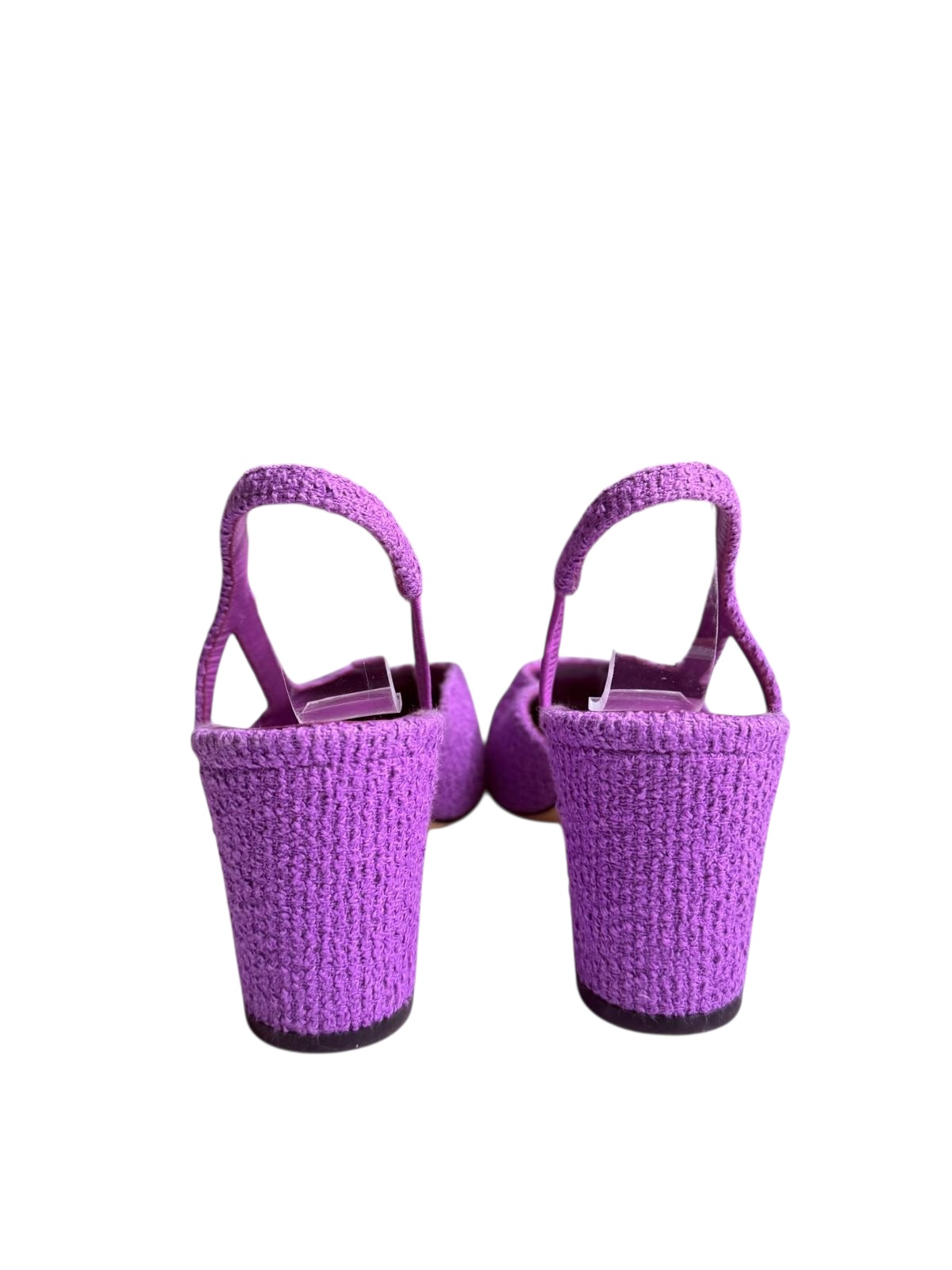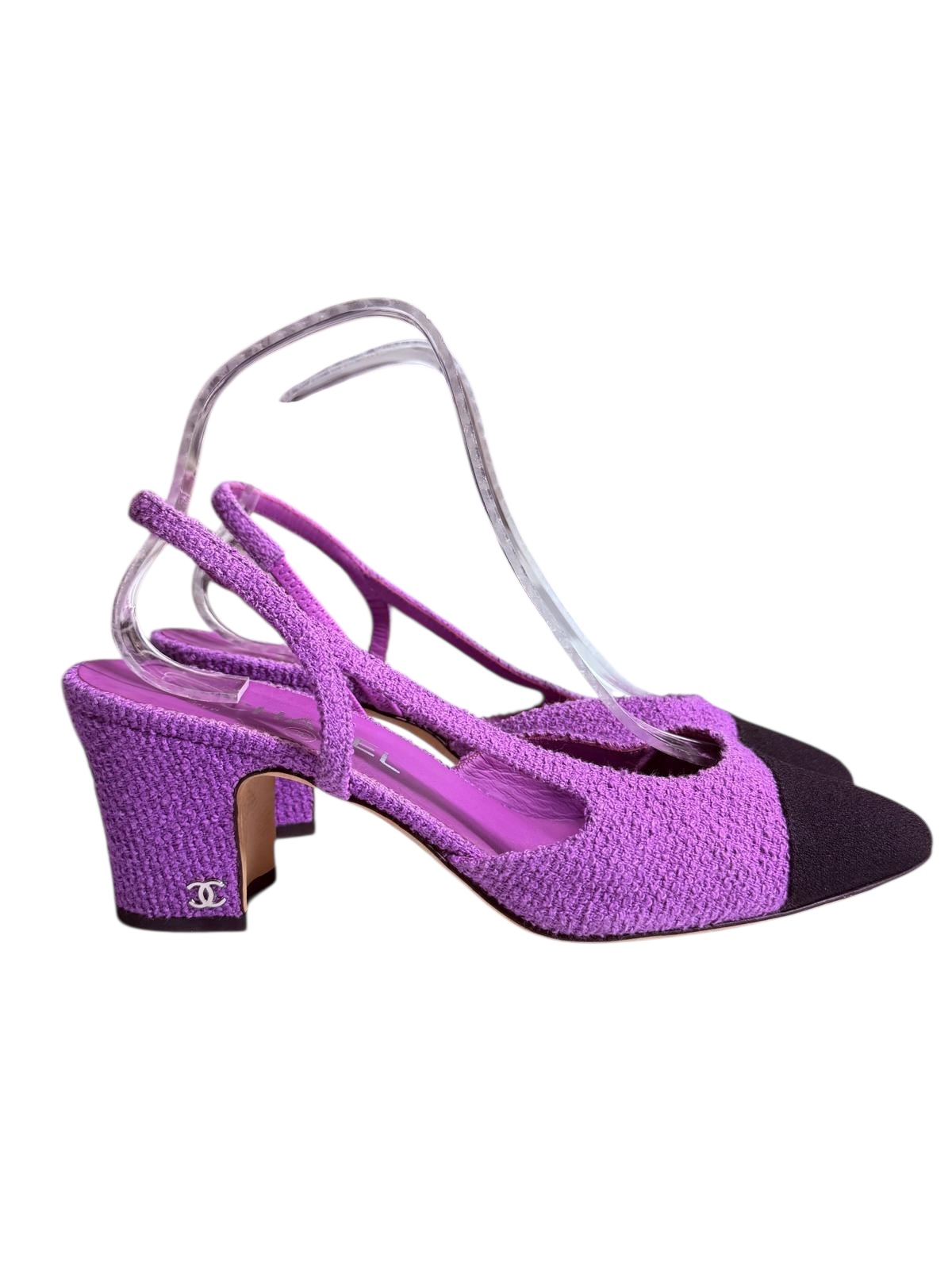 Ces escarpins Slingback Chanel revisitent l'un des designs les plus emblématiques de la Maison Chanel, créé originellement par Gabrielle Chanel en 1957. Cette version audacieuse se pare d'un tweed texturé violet éclatant, signature de la Maison, contrastant avec le bout noir.