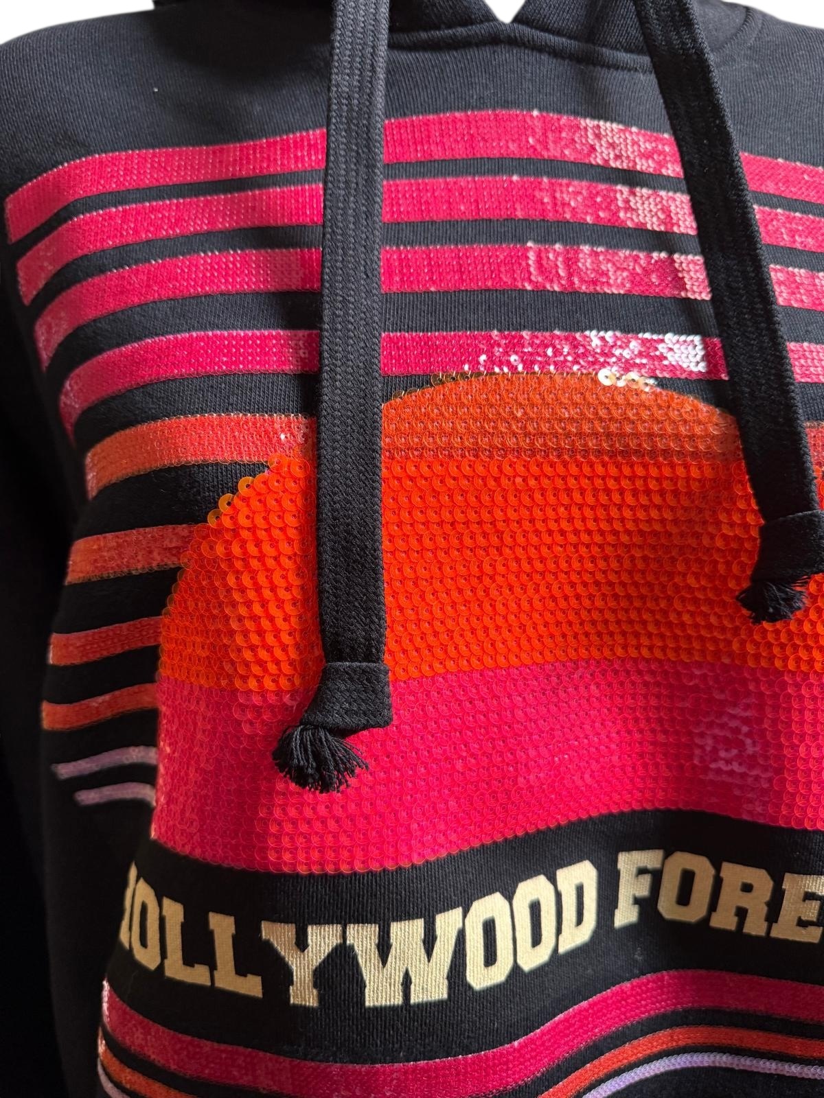 Ce hoodie Gucci est une pièce de collection issue de la ligne "Hollywood Forever", alliant parfaitement le confort du streetwear au luxe exubérant de la maison italienne. Confectionné de couleur noire, il arbore sur le devant un graphisme spectaculaire réalisé entièrement en sequins brodés, représentant un soleil couchant stylisé dans des tons rouges et roses vibrants. Le lettrage "Hollywood Forever" s'inscrit en lettres dorées contrastantes. Sa coupe décontractée est structurée par une capuche ajustable avec des cordons plats noirs et des finitions en bords-côtes aux poignets et à la taille. À la fois audacieux et facile à porter, ce pull est l'élément idéal pour apporter une touche de fantaisie haut de gamme et une allure résolument mode à une silhouette citadine.Sur l'étiquette, la taille indiquée est XXS (soit 32FR), mais attention ce pull est très oversized et peut convenir à une taille 38 FR.