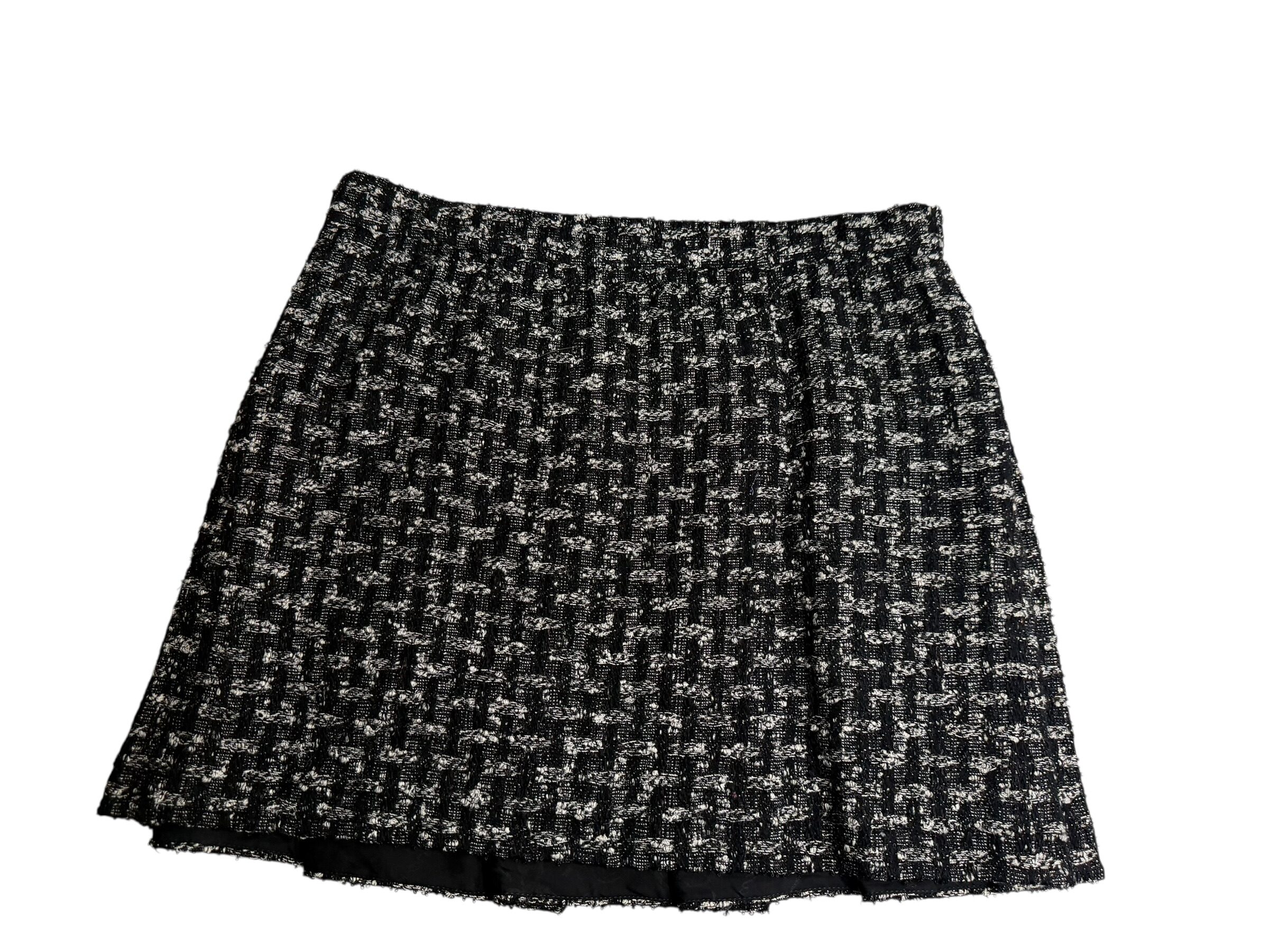 Cette jupe Chanel en tweed incarne l’élégance intemporelle du vestiaire de la maison. Réalisée dans un tweed noir et blanc richement texturé, elle présente un motif graphique subtil qui apporte profondeur et relief à la silhouette.