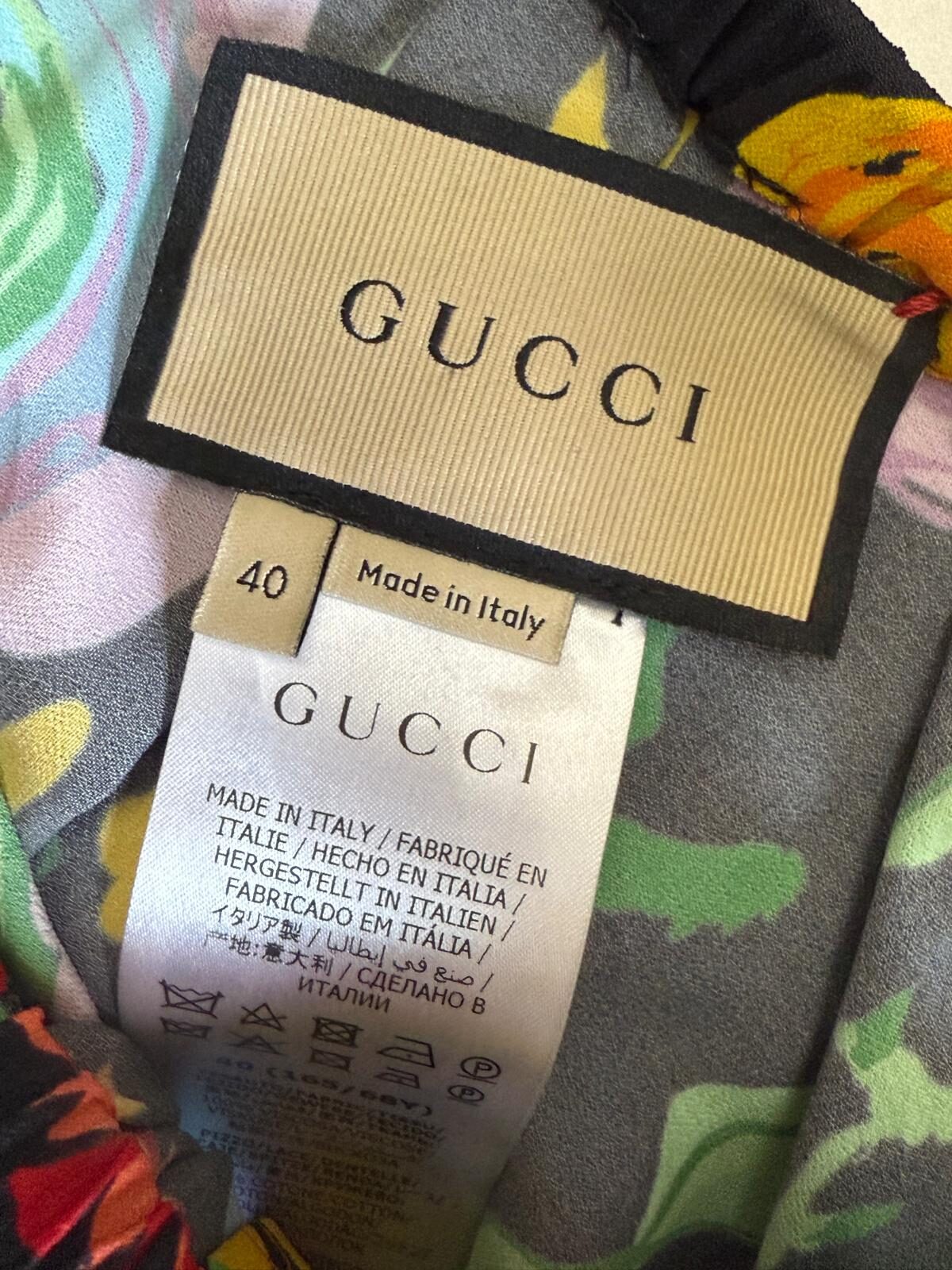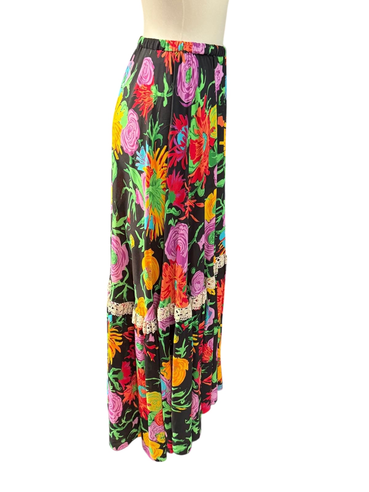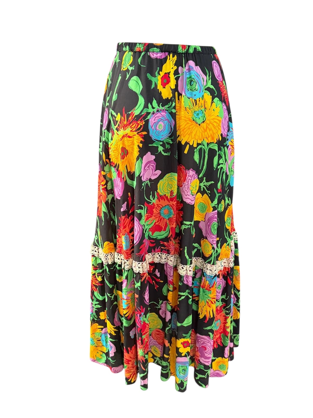 Cette jupe Gucci est une véritable ode au romantisme et au style bohème-chic. En soie, elle se distingue par son imprimé floral luxuriant et multicolore, mêlant des teintes de rouge, jaune, bleu et vert, sur un fond noir contrastant.