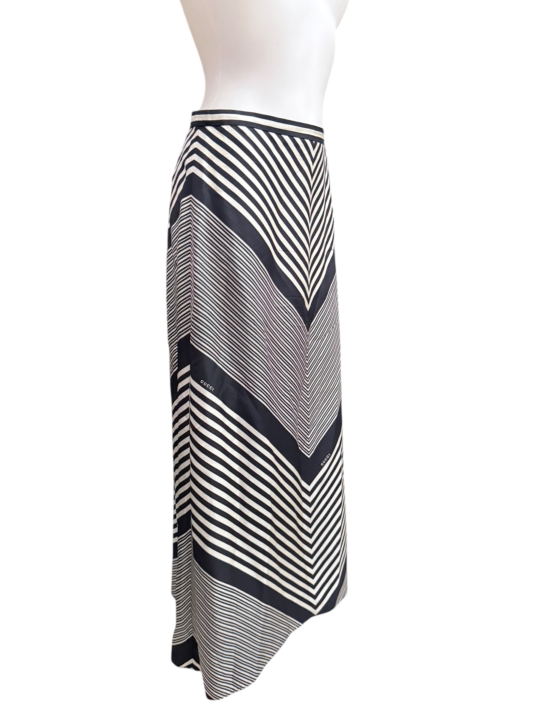 Cette jupe Gucci est une pièce magistrale qui joue sur les contrastes et les illusions d'optique. Elle se distingue par un motif chevron (zigzag) audacieux, avec des rayures noires et blanches.
