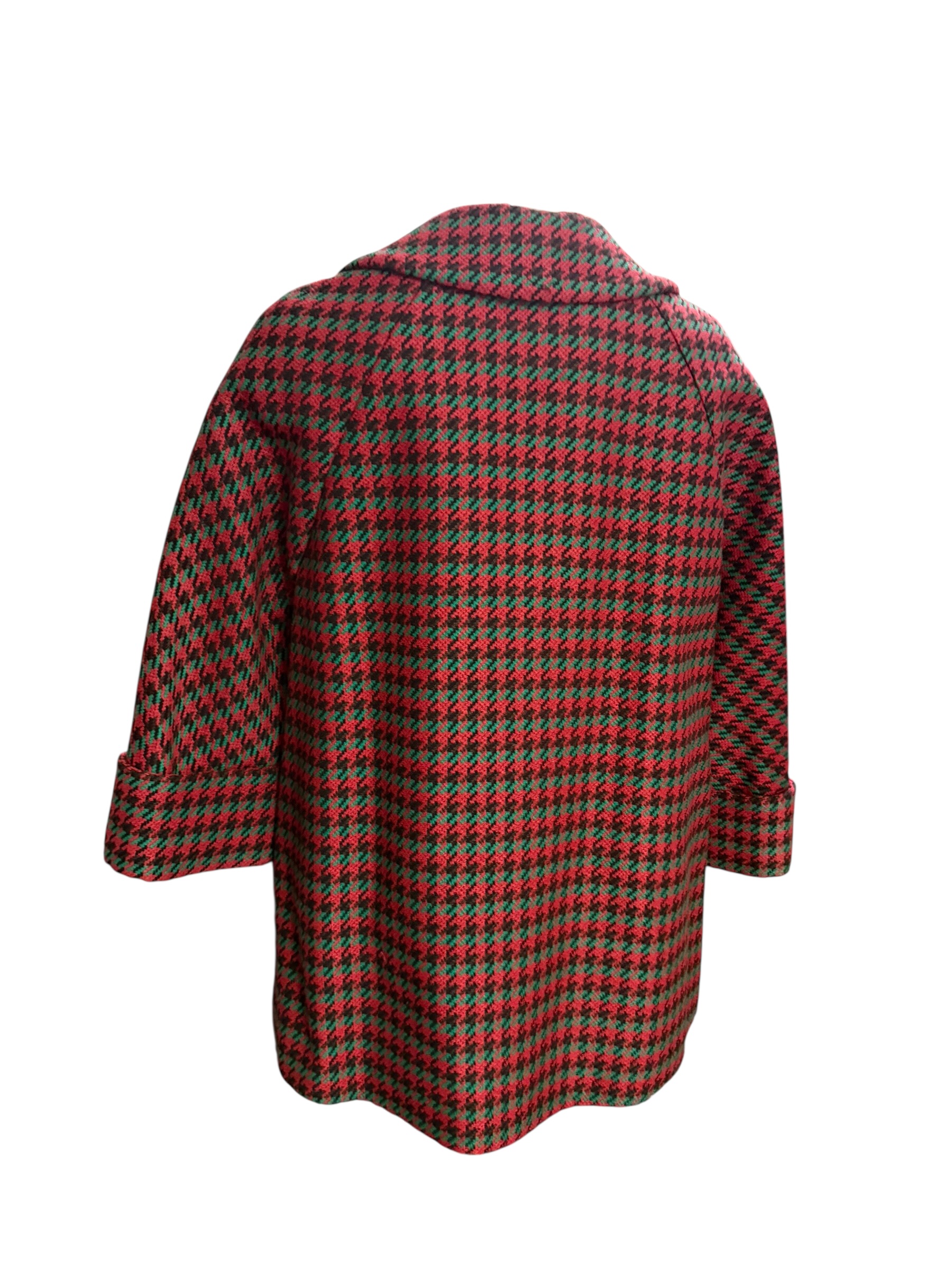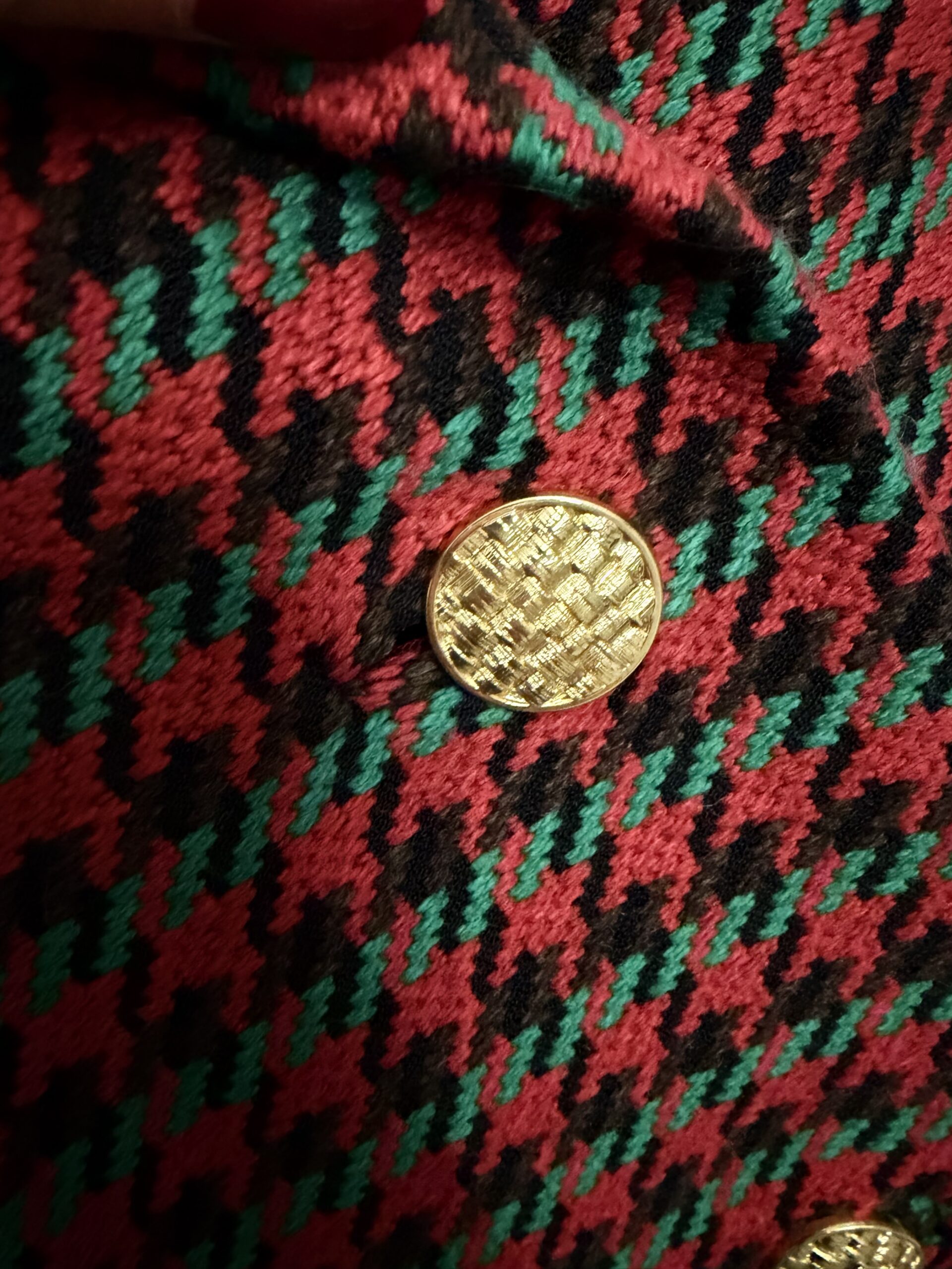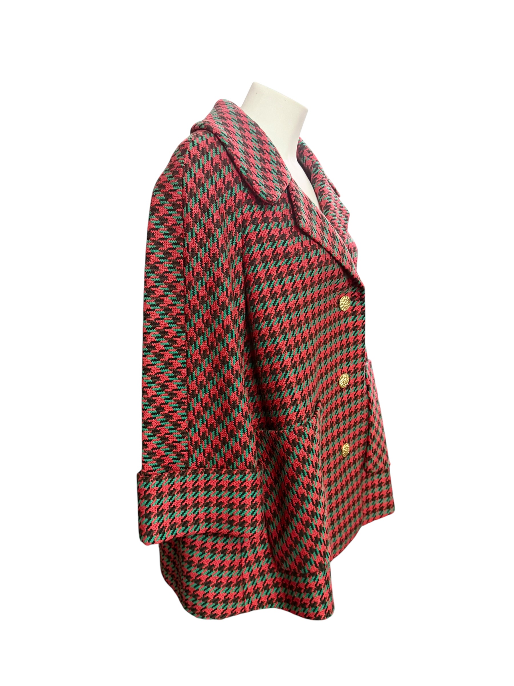 La coupe est structurée mais confortable, avec des manches 3/4 dotées de larges revers qui apportent une touche vintage des années 60. Le manteau se ferme sur le devant par trois boutons dorés travaillés, ajoutant une note de sophistication luxueuse à l'ensemble. Ce modèle est idéal pour rehausser une tenue sobre par une pièce forte au caractère affirmé.