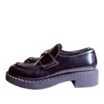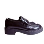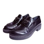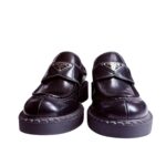 Le design se caractérise par une silhouette imposante et structurée, soulignée par une semelle crantée en gomme épaisse qui offre une allure contemporaine et un confort optimal. Sur le dessus, la bride est ornée de l'emblématique logo triangle. Les surpiqûres apparentes sur le plateau et le long de la semelle témoignent du savoir-faire artisanal italien, faisant de ces mocassins un indispensable pour un look "preppy" revisité avec une touche punk-chic.