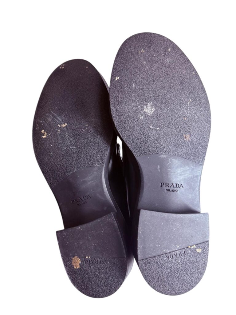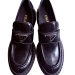 Ces mocassins Prada sont une réinterprétation moderne et audacieuse du soulier classique, devenus une véritable pièce culte de la Maison. Ils sont confectionnés en cuir brossé noir, un cuir de veau emblématique de Prada reconnu pour son fini brillant et sa grande durabilité.