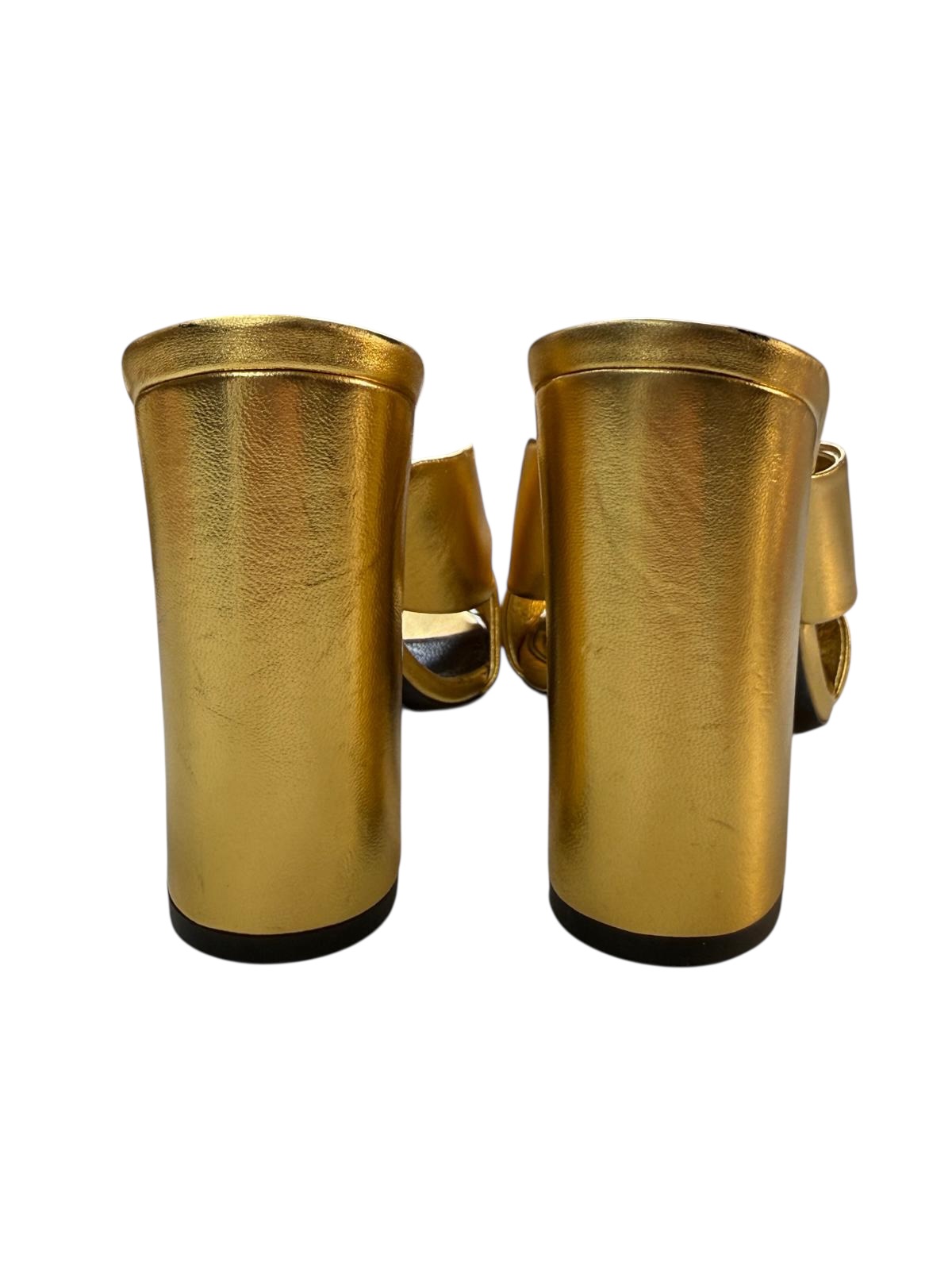 Confectionnées dans un cuir d'agneau lamé doré, elles captent la lumière à chaque mouvement. Ce modèle est monté sur un talon bloc haut et robuste, offrant une stabilité remarquable malgré la hauteur, ce qui les rend idéales pour de longues soirées.