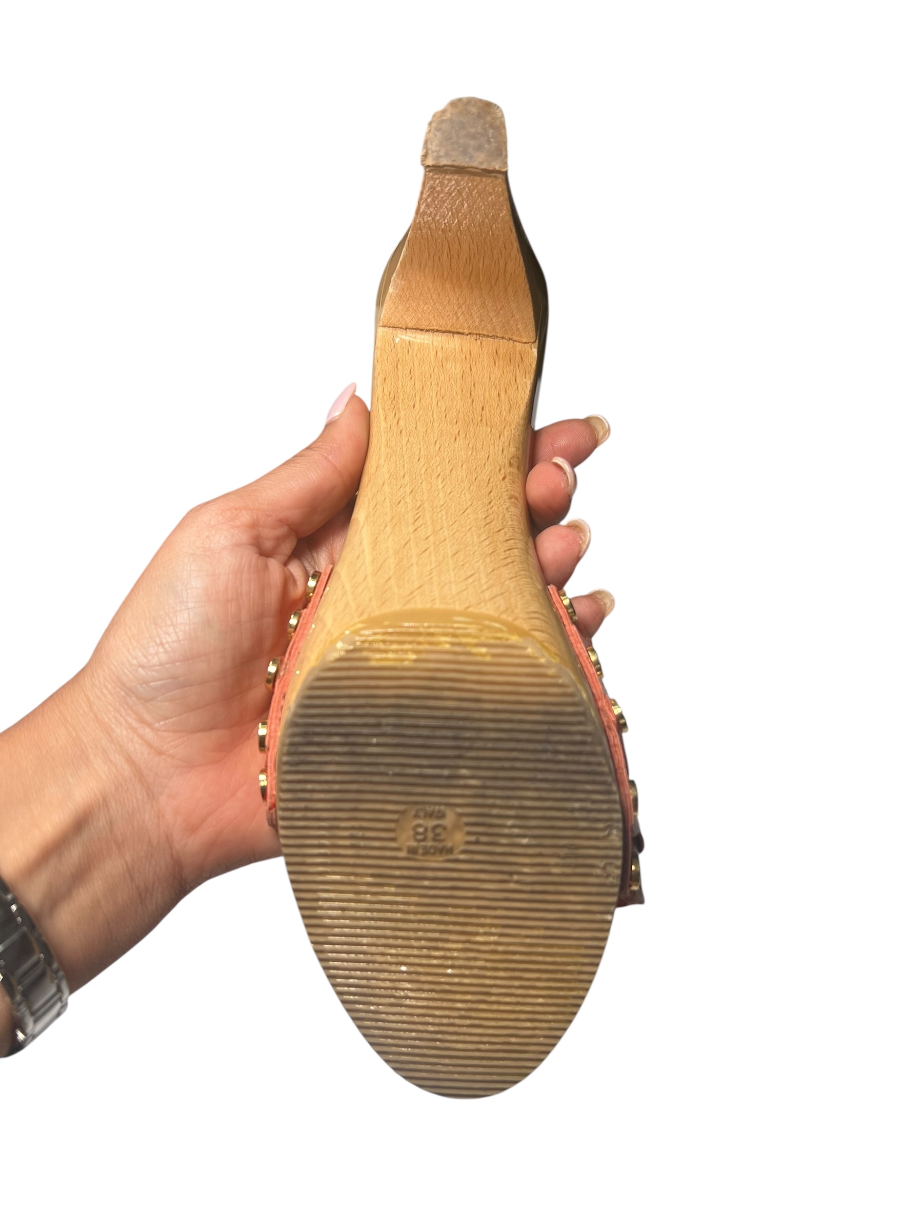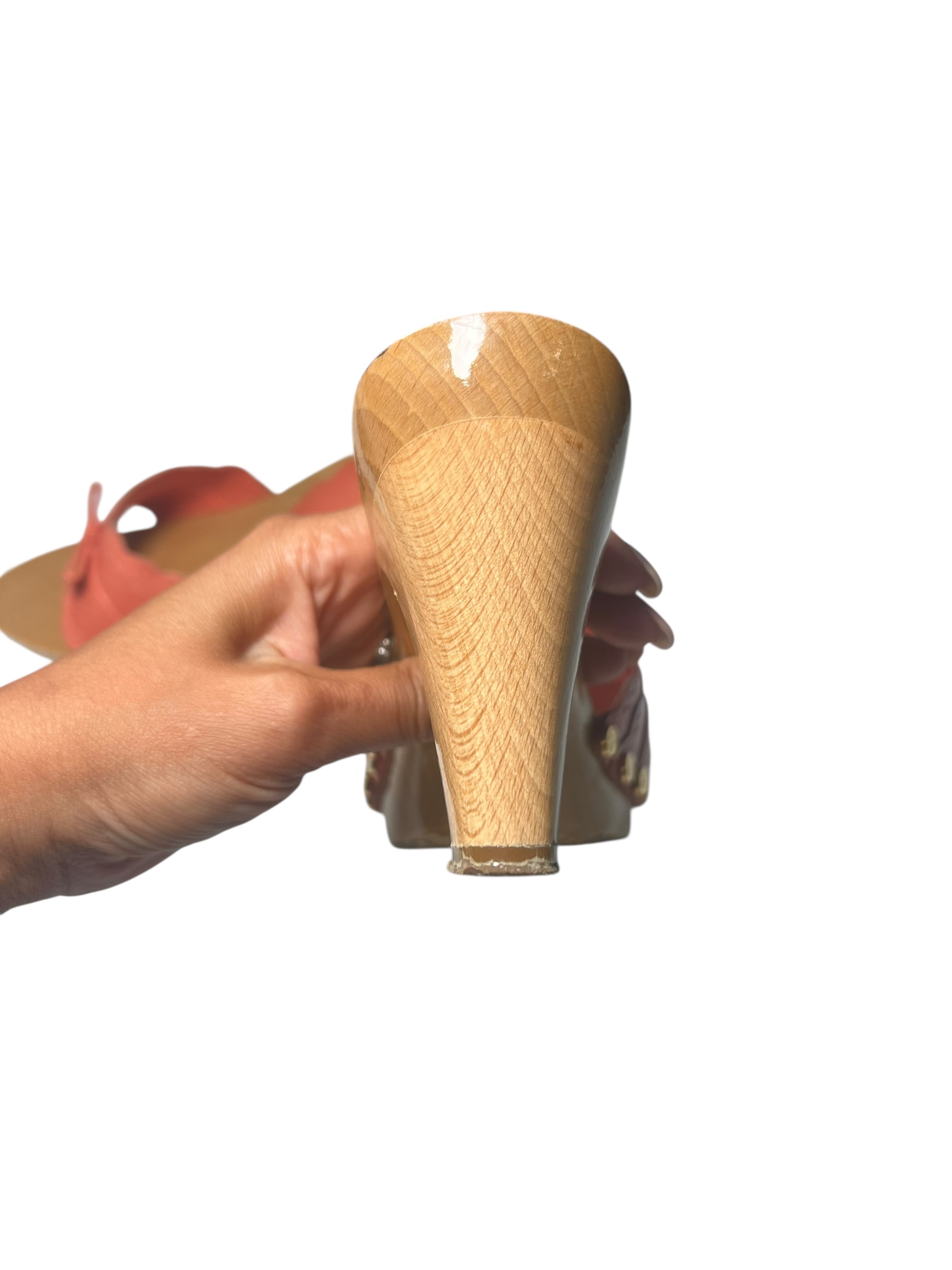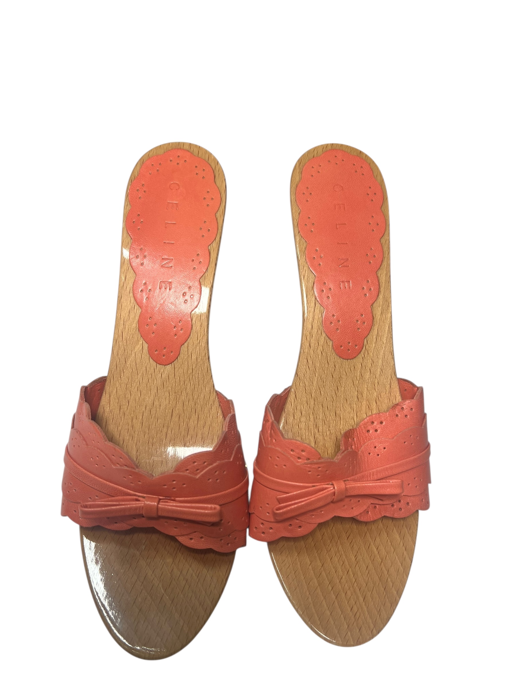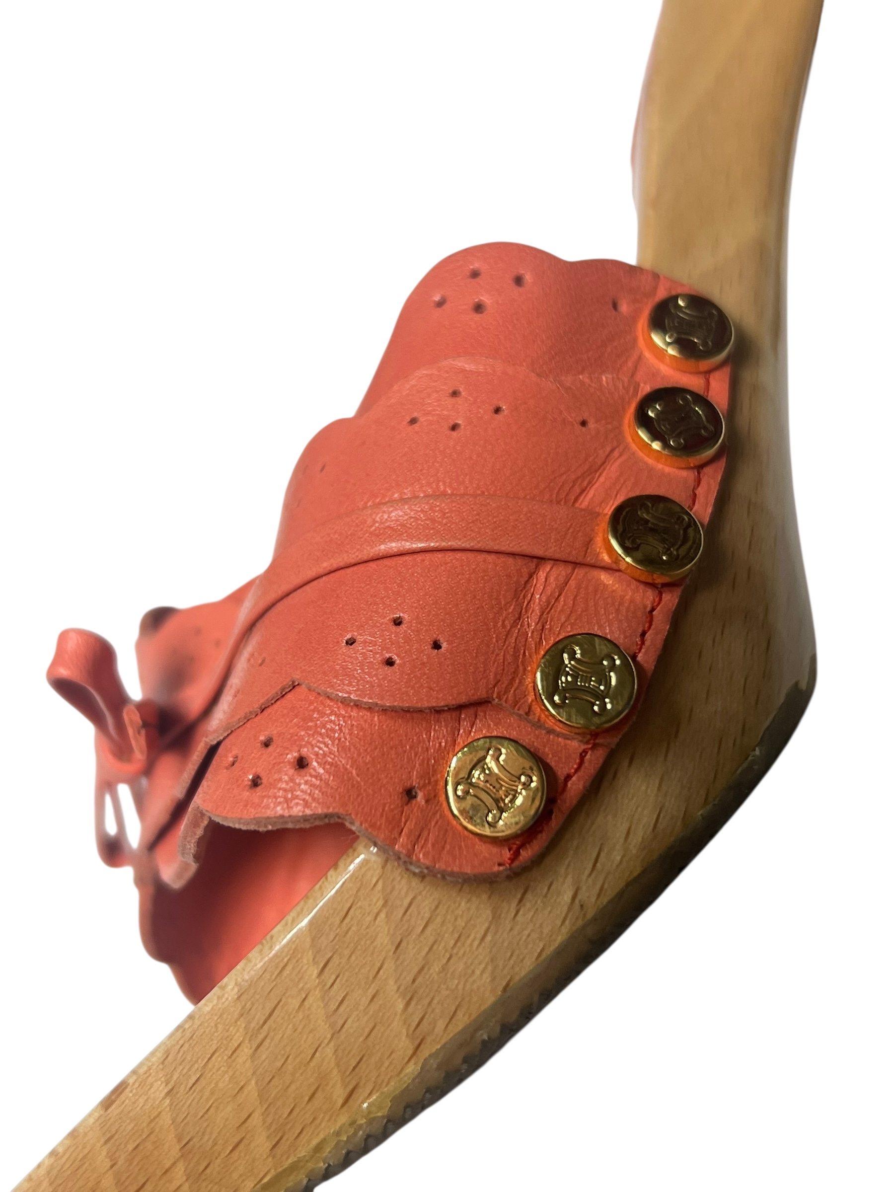 Incarnez l'esprit bohème-chic de la maison Céline avec ces superbes mules de style sabot. Montées sur une semelle en bois authentique, elles se distinguent par leur magnifique bride en cuir corail, délicatement perforée et festonnée. La chaussure d'été parfaite pour une allure à la fois rétro et sophistiquée.