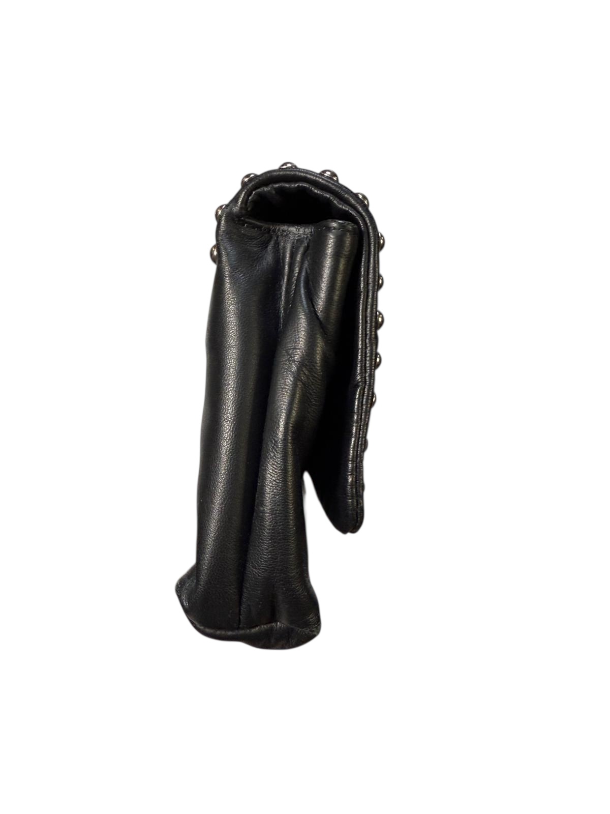 Exprimez une attitude rock et chic avec cette pochette Louboutin, un accessoire audacieux qui ne passe pas inaperçu. Confectionnée en cuir de veau souple noir, elle présente une silhouette de pochette à rabat ("fold-over") à la fois pratique et élégante. L'intérieur révèle la doublure rouge vif emblématique de la maison, une touche de passion et de luxe cachée. Son design est défini par un agencement graphique de clous plats en métal argenté qui bordent le rabat, ajoutant une touche rebelle et sophistiquée. Parfaite pour électriser une tenue de soirée, cette pochette est un symbole du glamour audacieux du créateur parisien.