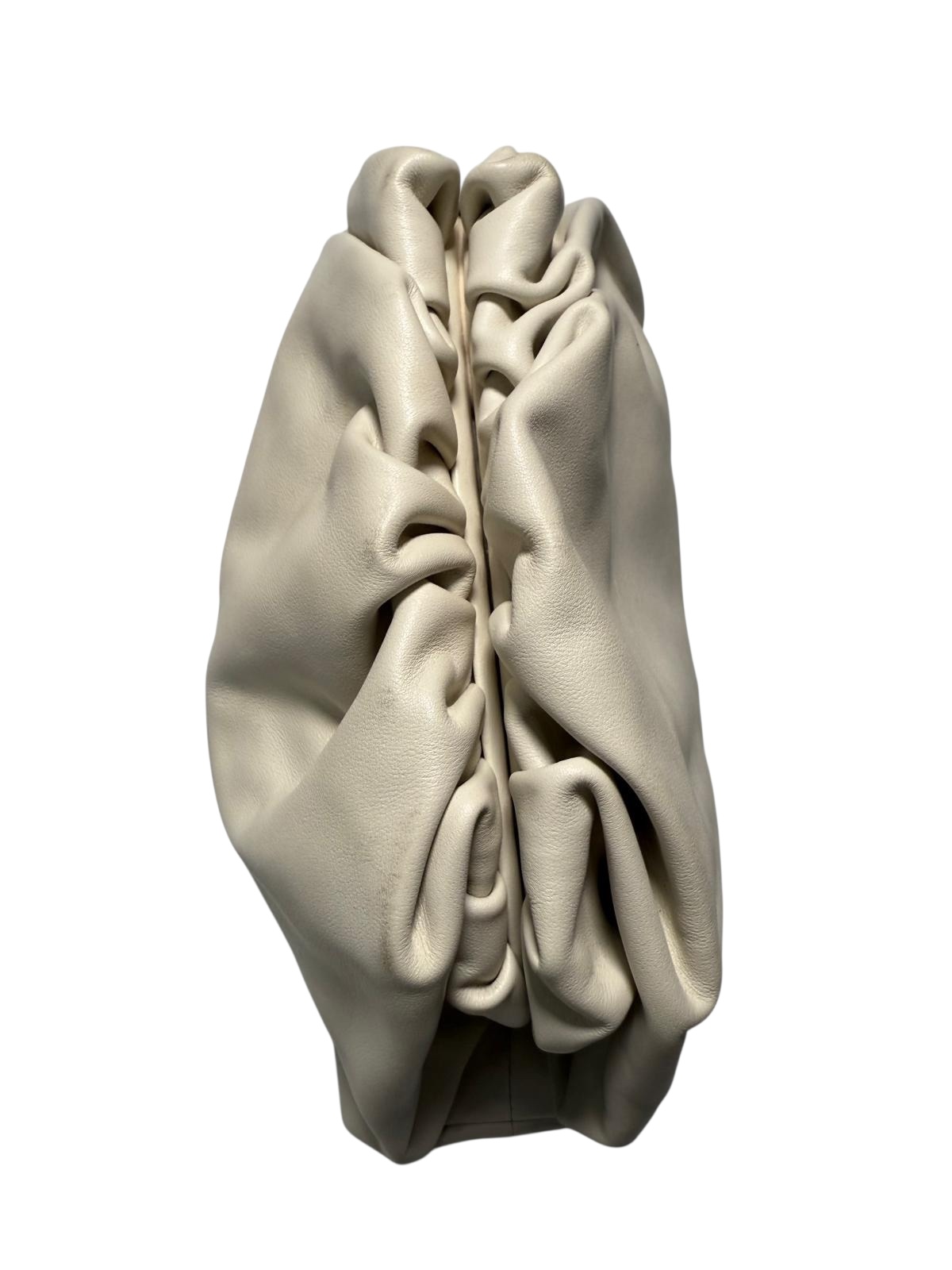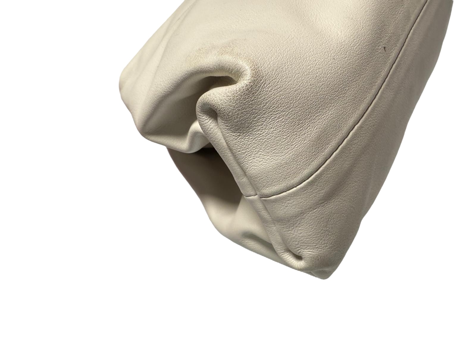Adoptez un style intemporel avec cette pochette de la maison Bottega Veneta. Pièce emblématique de la marque, elle allie un design classique et une couleur vive. Cette pochette est confectionnée en cuir lisse blanc. Sa forme est arrondie, et elle est dotée d'une fermeture aimantée qui forme un pli sur le dessus. Le sac n'a pas de poignées ou de sangles apparentes, et il peut être porté à la main pour une tenue de soirée, ou en journée.