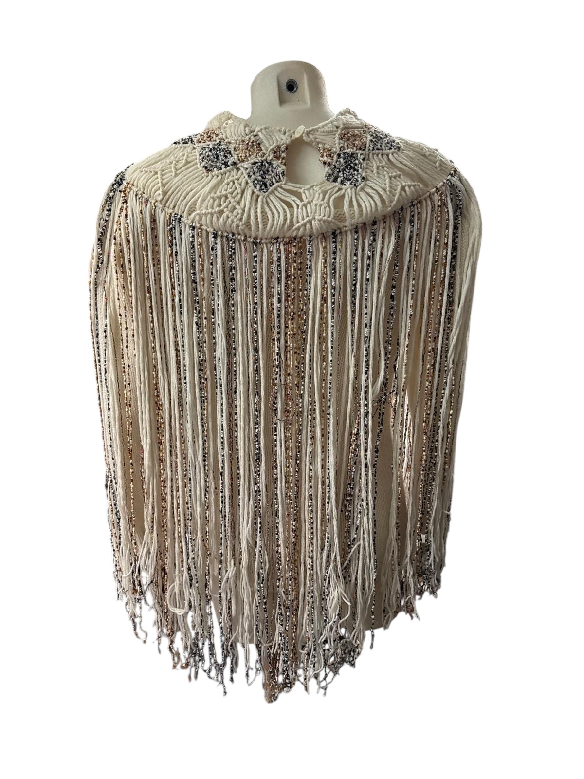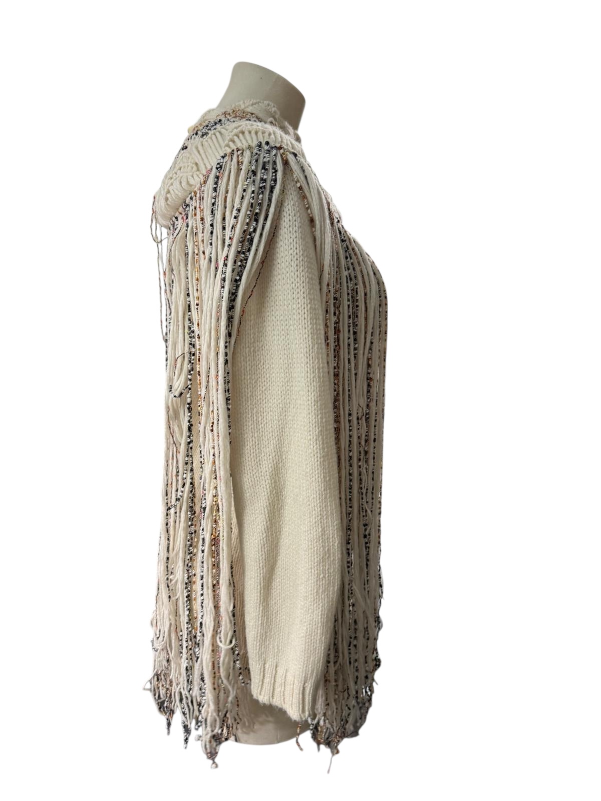 Le haut du vêtement présente un empiècement circulaire au col montant, richement décoré de broderies complexes dans des tons sombres et bleutés. De cet empiècement s'échappe une cascade de longues franges bicolores qui recouvrent le buste, créant un mouvement fluide et hypnotique à chaque geste. Cette pièce forte, inspirée par l'esthétique mexicaine et le travail de Frida Kahlo, allie la structure d'un pull classique à la légèreté aérienne d'une pièce de défilé.