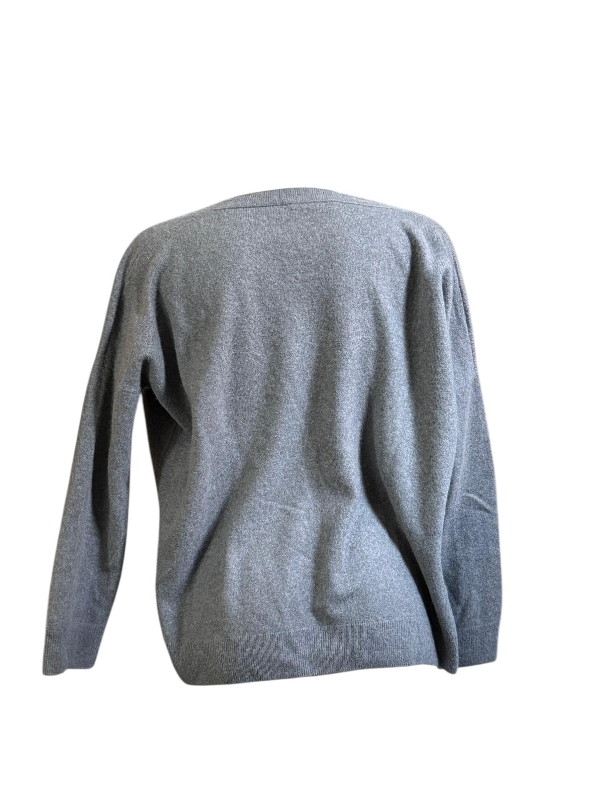 Le design se caractérise par une coupe décontractée et fluide, accentuée par un col en V classique qui allonge délicatement la silhouette. La maille présente une texture lisse et régulière dans une nuance de gris souris chiné, facile à coordonner avec toutes les pièces d'un vestiaire élégant. On note des finitions soignées avec des fentes latérales au bas du vêtement, permettant un tombé impeccable sur les hanches. C'est une pièce basique de très haute qualité, conçue pour durer des années sans perdre de sa superbe.