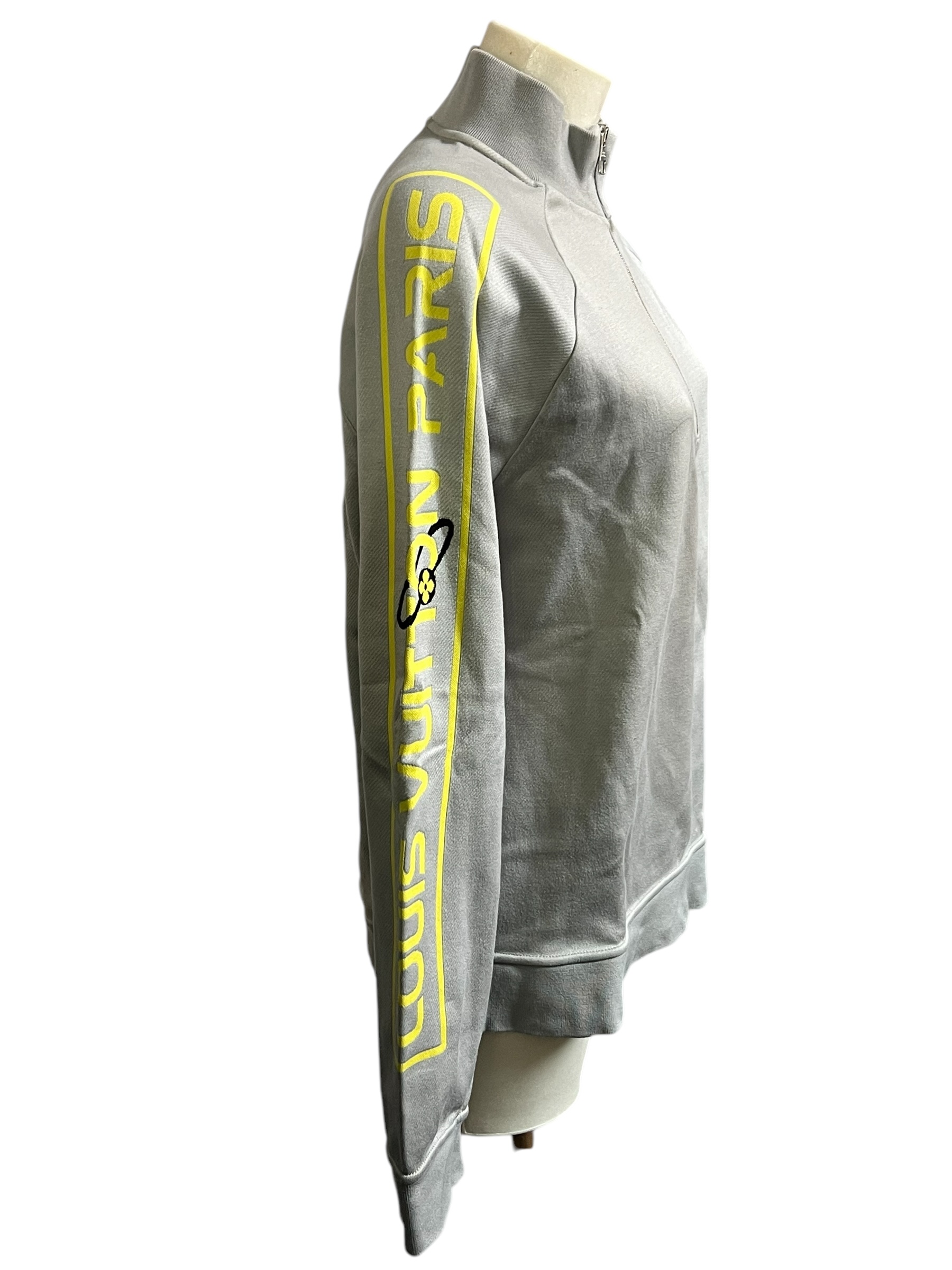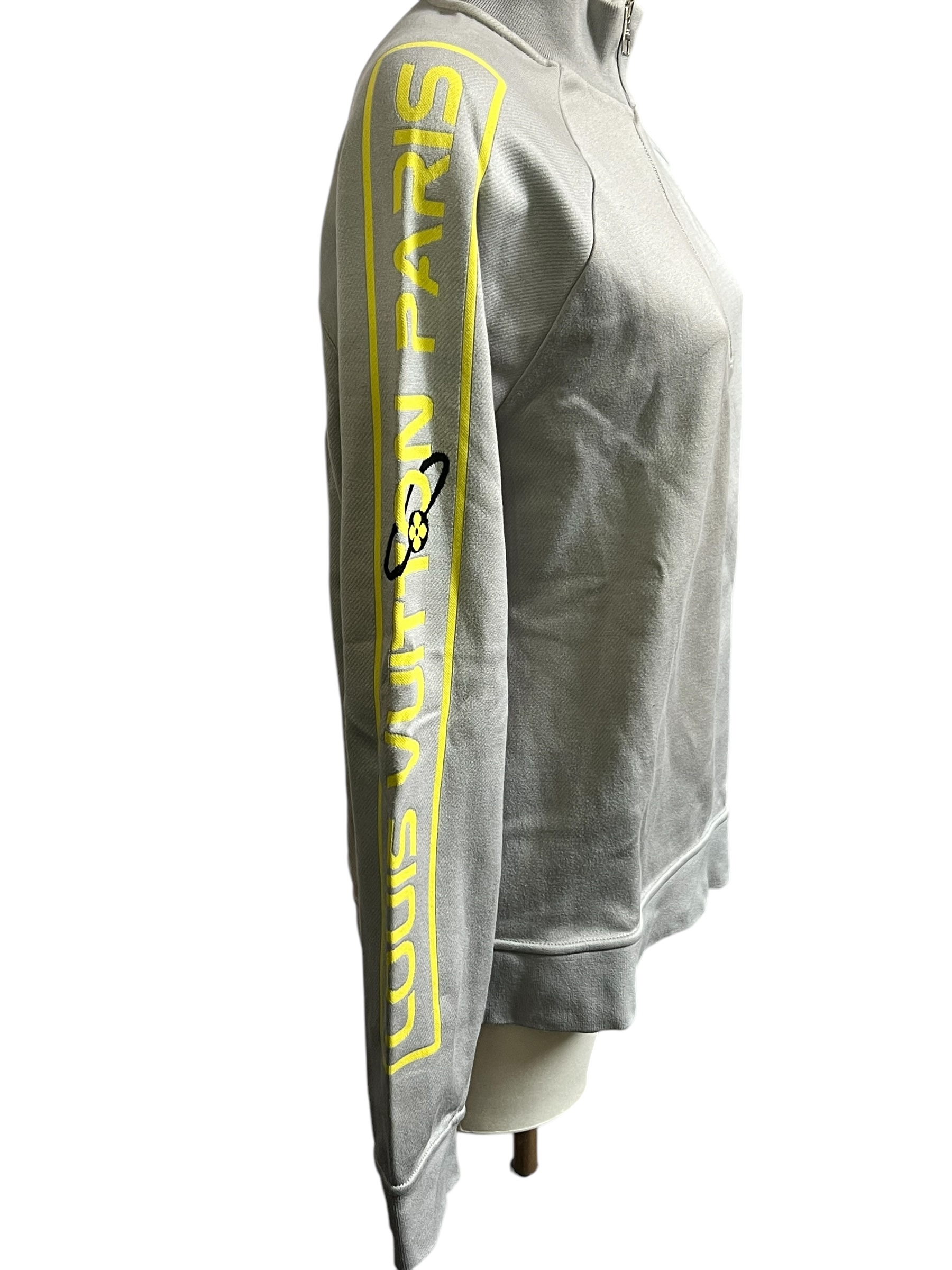 Ce pull Louis Vuitton en molleton gris se distingue par son style sportif et ses détails graphiques. Il présente une fermeture éclair mi-longue sur un col montant, et une silhouette à manches raglan. Les manches et les épaules sont sublimées par des bandes et des logos "LOUIS VUITTON" en néon jaune, apportant une touche de couleur vive et contemporaine. Idéal pour un look sportswear chic et urbain, il se porte facilement avec un pantalon de jogging ajusté, un jean ou un short pour un style affirmé et moderne.