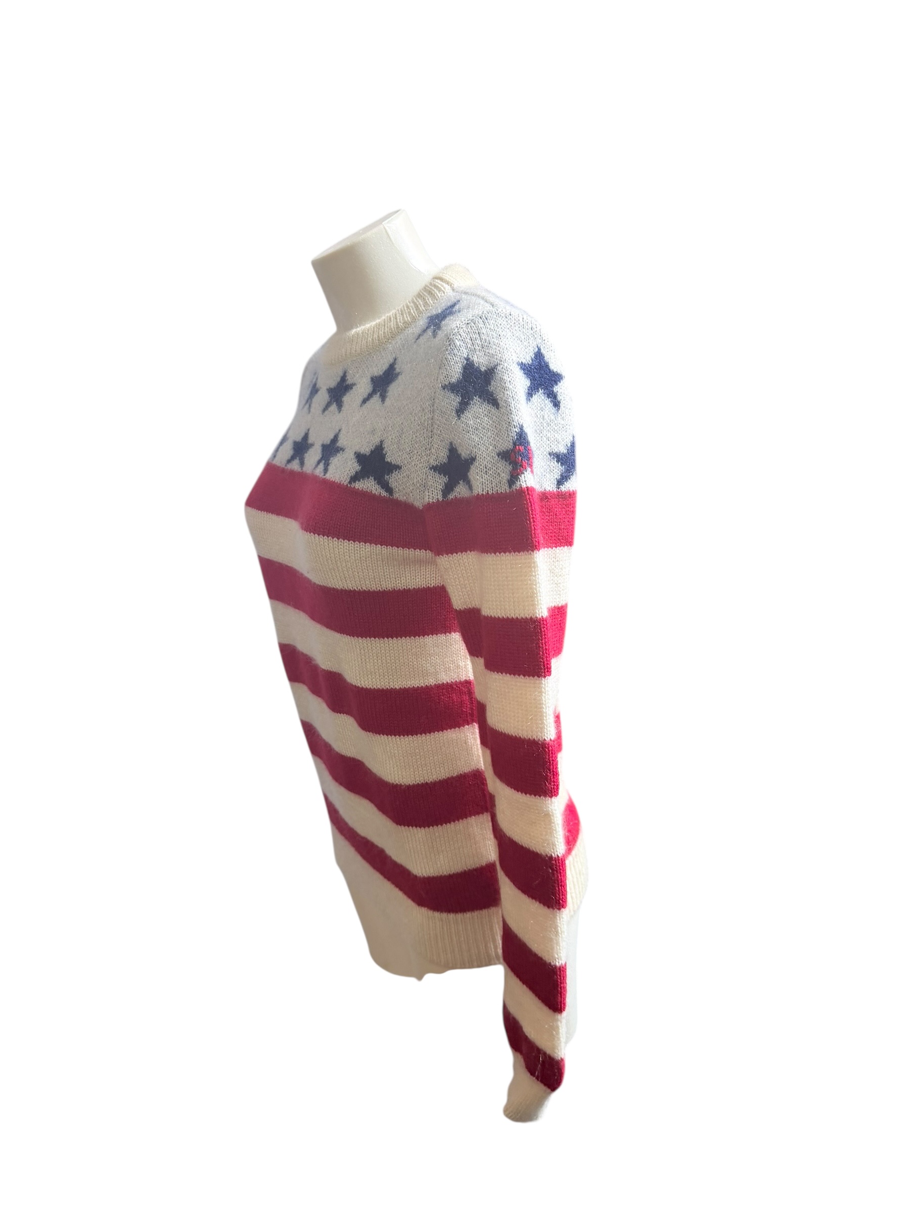 Le design rend hommage au drapeau américain avec un travail de jacquard précis : le haut du buste et des manches est orné d'une bande de fines étoiles bleues sur fond blanc et bleu, tandis que le reste du corps et des manches décline des rayures horizontales rouges et blanches. La coupe est ajustée avec des finitions en bords-côtes blancs au col rond, aux poignets et à l'ourlet, structurant parfaitement la silhouette. C'est une pièce de collection idéale pour un look décontracté mais hautement stylisé.