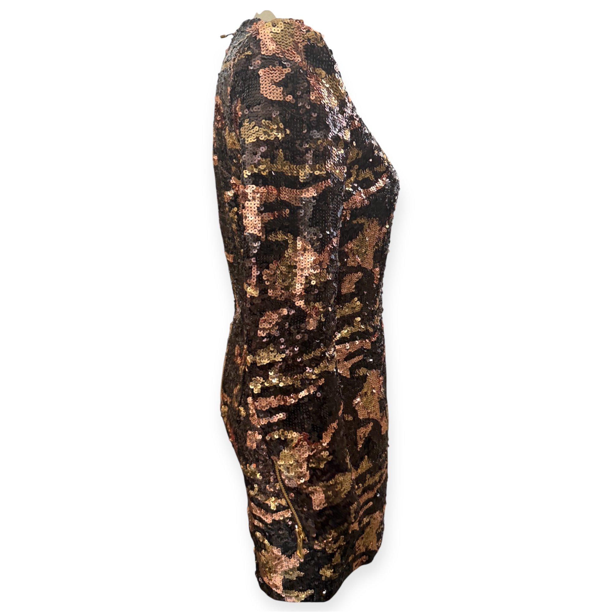 Cette robe Balmain se distingue par une silhouette audacieuse et sculpturale, emblématique de l’esthétique affirmée de la maison. Entièrement recouverte de sequins dans des tons noirs/marrons et dorés, elle présente un motif graphique apportant profondeur et caractère à la pièce.