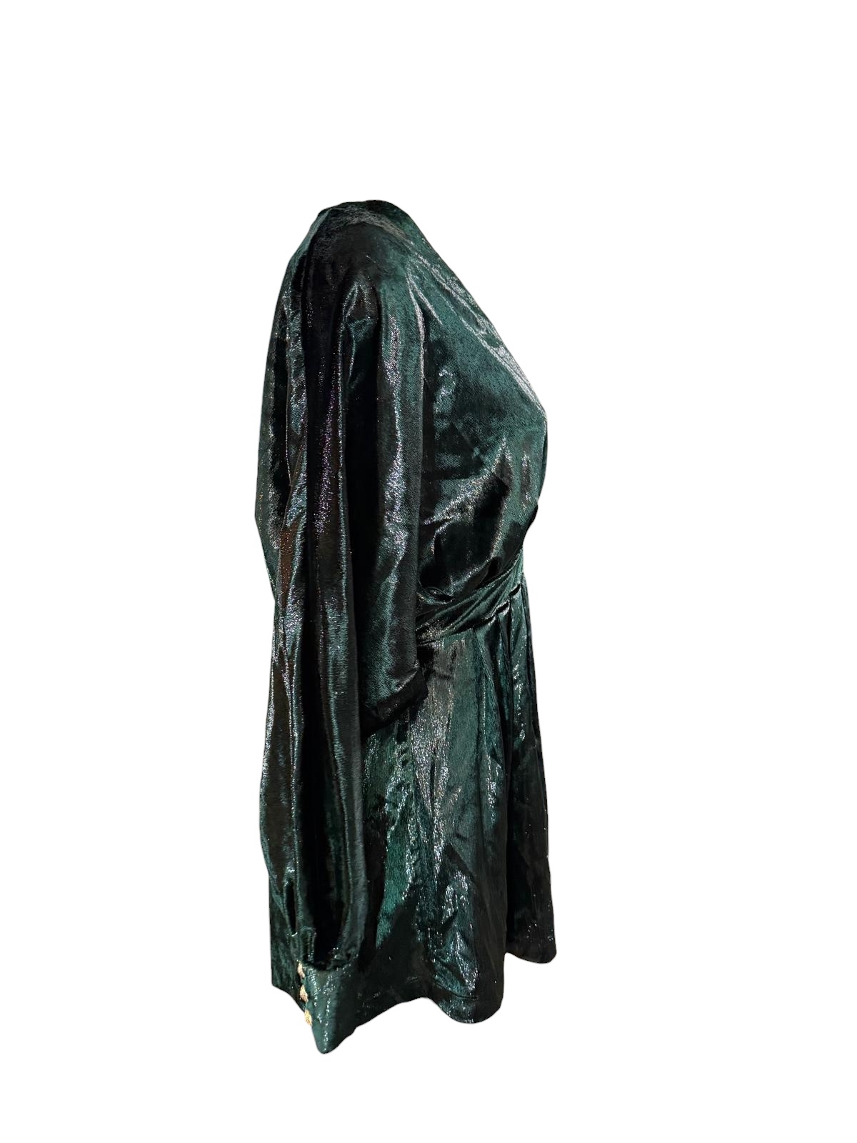 Le design se caractérise par un décolleté en V plongeant audacieux et des manches longues de style chauve-souris, apportant un volume fluide au haut du corps. La taille est marquée par une large bande ajustée qui structure la silhouette avant de s'évaser en une jupe courte froncée. Cette pièce est idéale pour une soirée chic ou un événement festif.