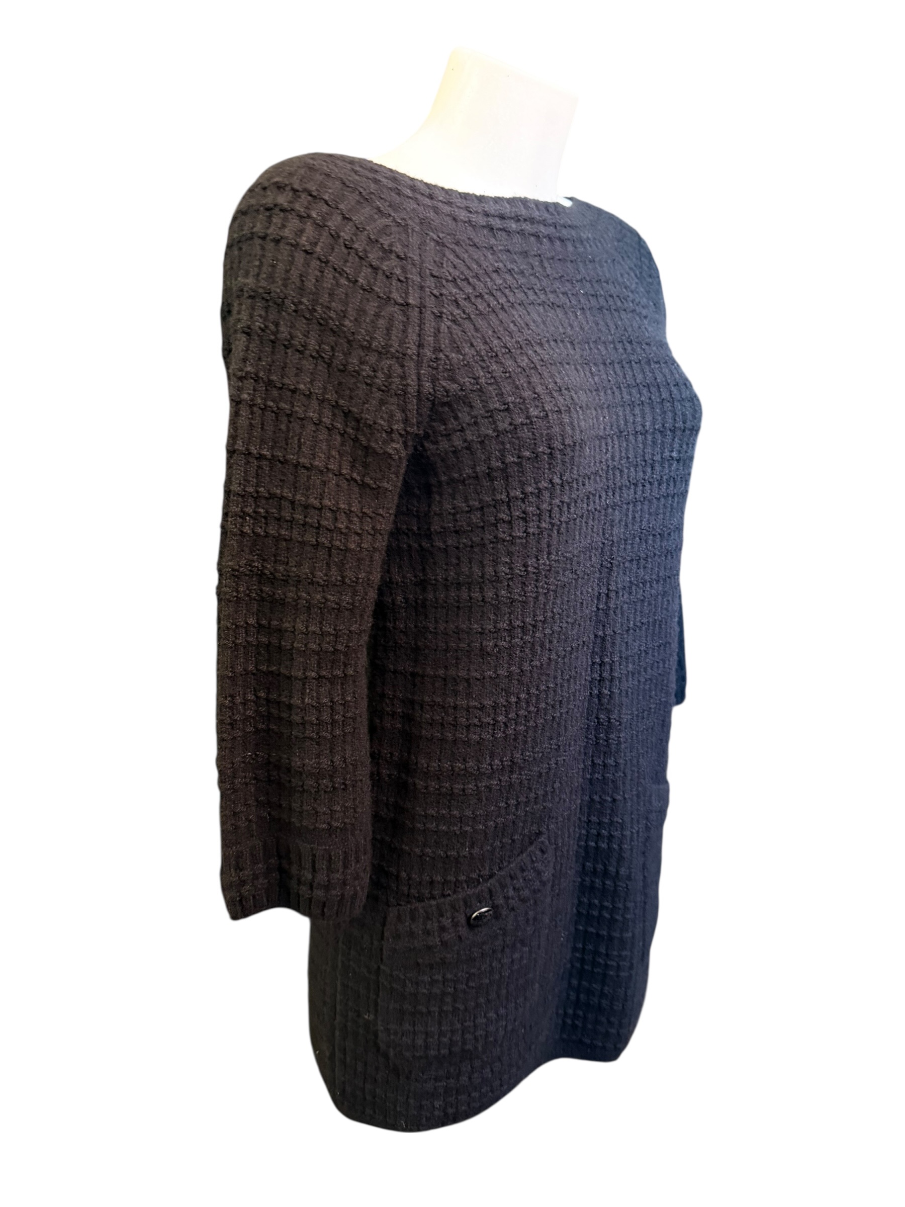 Sa coupe droite légèrement évasée accompagne naturellement la silhouette tout en conservant une allure raffinée et confortable. L’encolure ronde et les manches trois-quarts soulignent la pureté des lignes, mettant en valeur la richesse de la matière et la finesse du travail de maille. Deux poches plaquées sur le devant viennent ponctuer la pièce avec élégance, chacune ornée d’un bouton métallique siglé qui rappelle les codes emblématiques de Chanel.