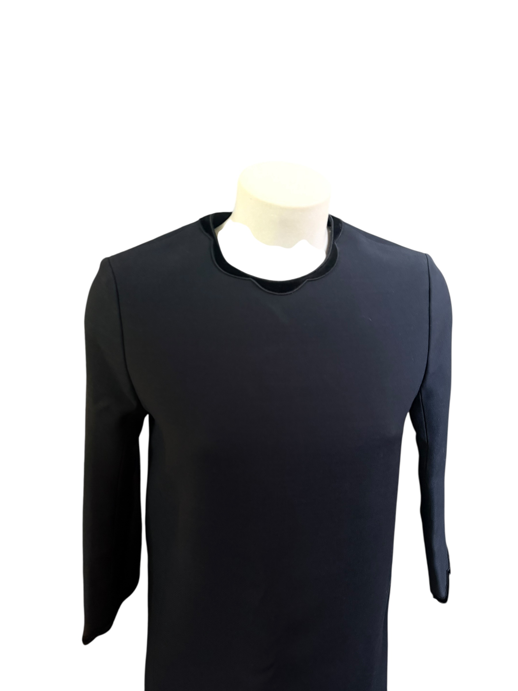 Le design se distingue par sa coupe droite légèrement trapèze, sublimée par des finitions en velours délicates au niveau de l'encolure ronde, des poignets et de l'ourlet. Ces détails découpés apportent une touche de féminité douce et de relief à la silhouette épurée. Avec ses manches longues et sa coupe sobre, cette "petite robe noire" revisitée est un essentiel polyvalent, idéal pour une allure chic en journée comme en soirée.