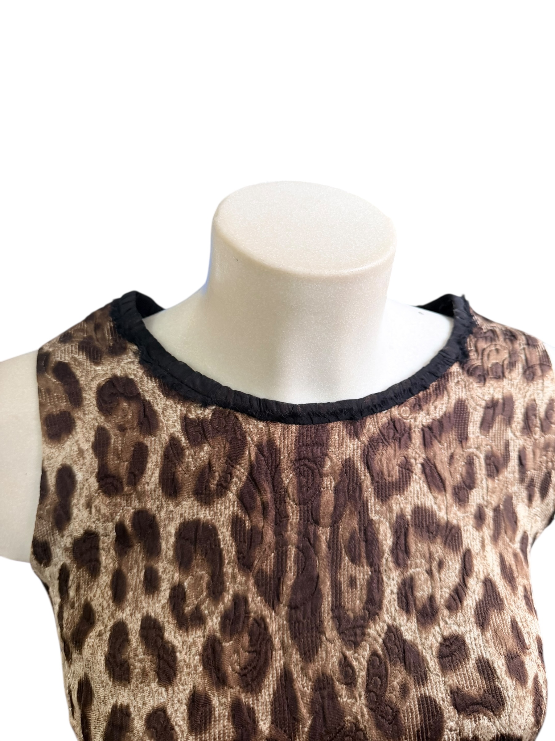Cette robe Dolce Gabbana sans manches est une célébration de l'ADN le plus pur de la Maison. Elle arbore l'imprimé léopard iconique, réalisé avec une précision de détails qui imite la texture naturelle du pelage sauvage. Confectionnée dans un mélange de laine et soie, elle offre une coupe ajustée qui galbe parfaitement la silhouette.
