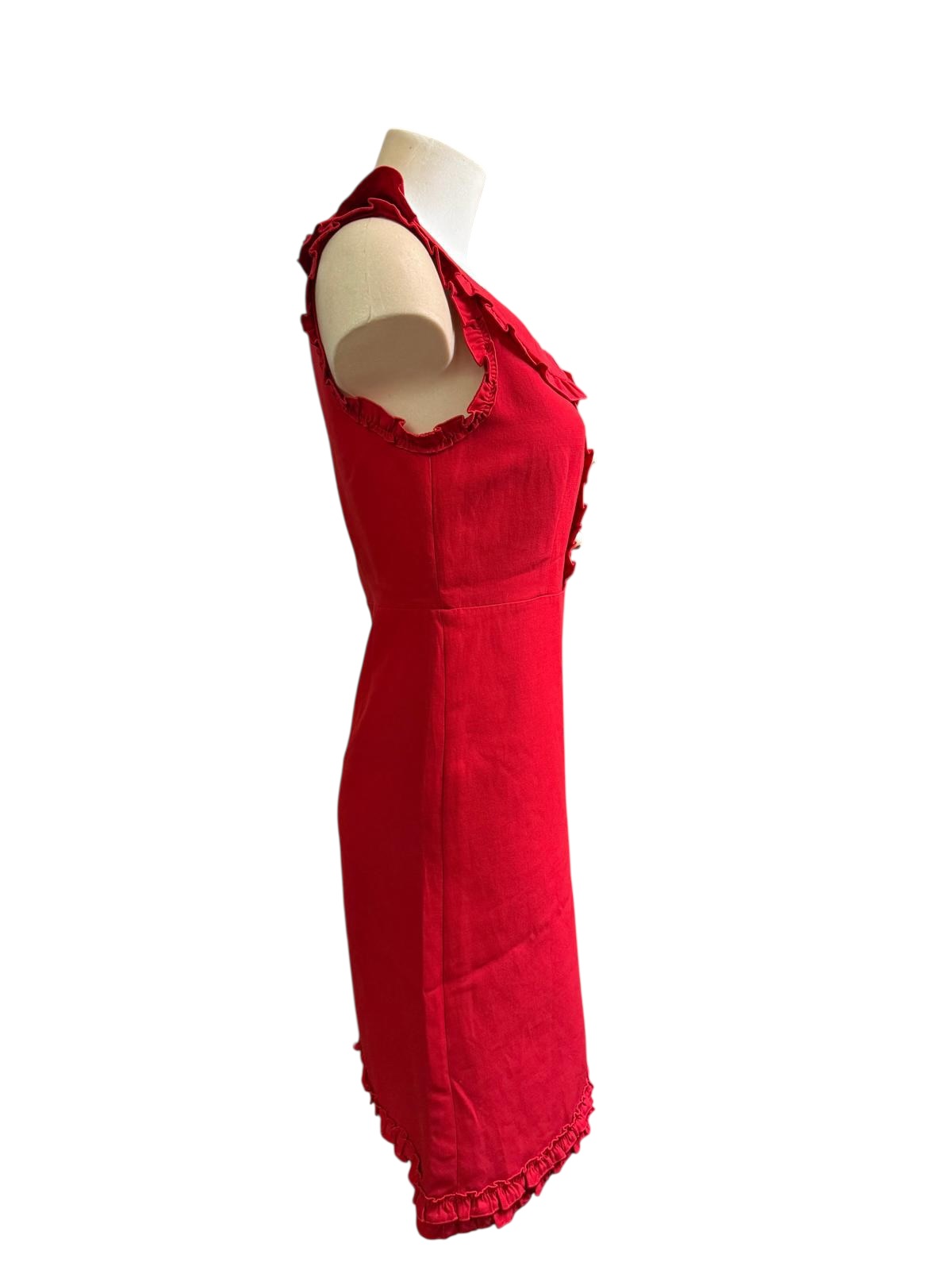 D'un rouge vif, le design se distingue par ses détails féminins raffinés : un large col Claudine bordé de volants délicats et un plastron central orné de boutons perles fantaisie sertis d'un double G discret. La silhouette sans manches présente des emmanchures également volantées, accentuant l'esprit "baby doll" de la pièce. Sa coupe trapèze légèrement évasée vers le bas assure un confort optimal tout en allongeant la jambe. C'est une robe de jour idéale, à la fois fraîche et sophistiquée.