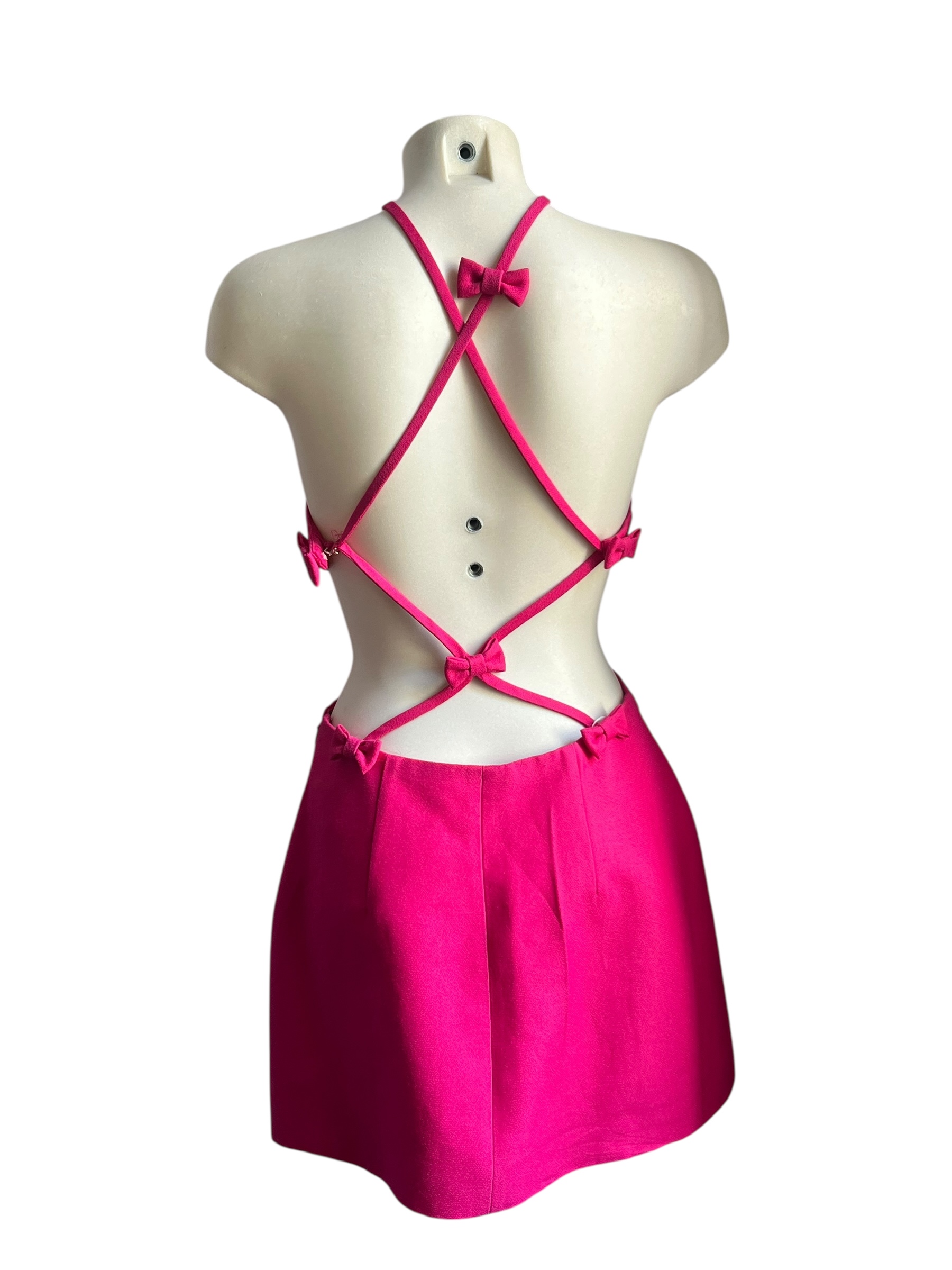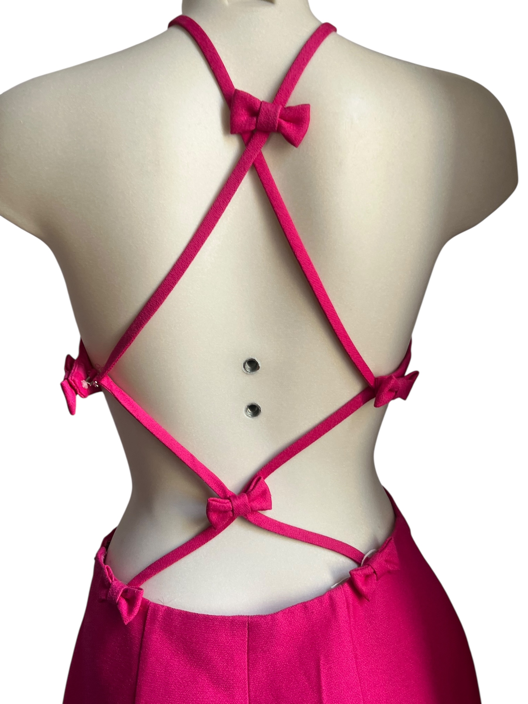 Le design se distingue par sa coupe architecturale audacieuse. Le dos est le point focal de la pièce : un jeu de brides croisées sophistiqué laisse le dos entièrement nu. Chaque intersection des brides est ornée de petits nœuds délicats, apportant une touche de féminité couture et de raffinement artisanal. Cette robe offre une tenue structurelle parfaite pour une allure tapis rouge inoubliable.