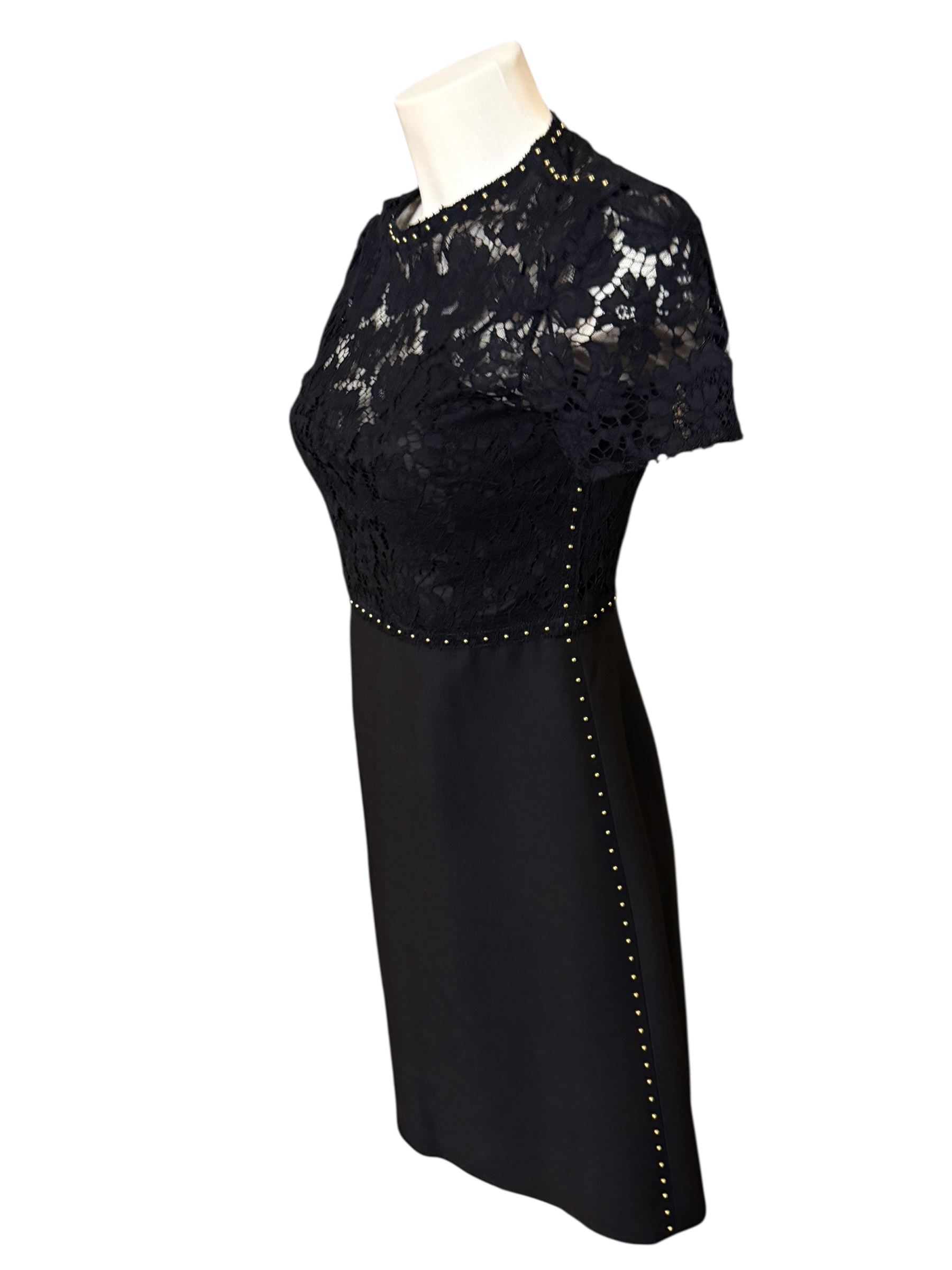 Cette robe Valentino est une pièce d'exception. Le design se distingue par un plastron et des manches courtes en dentelle florale délicate, créant un jeu de transparence sophistiqué sur le haut du buste et dans le dos. La transition entre la dentelle et le tissu structuré est soulignée par une rangée de micro-clous dorés, qui parcourent également la ligne de taille et les coutures latérales pour une touche de modernité audacieuse.