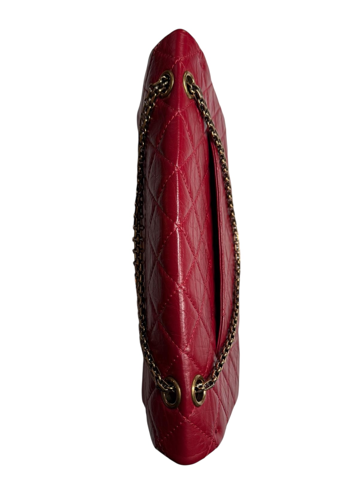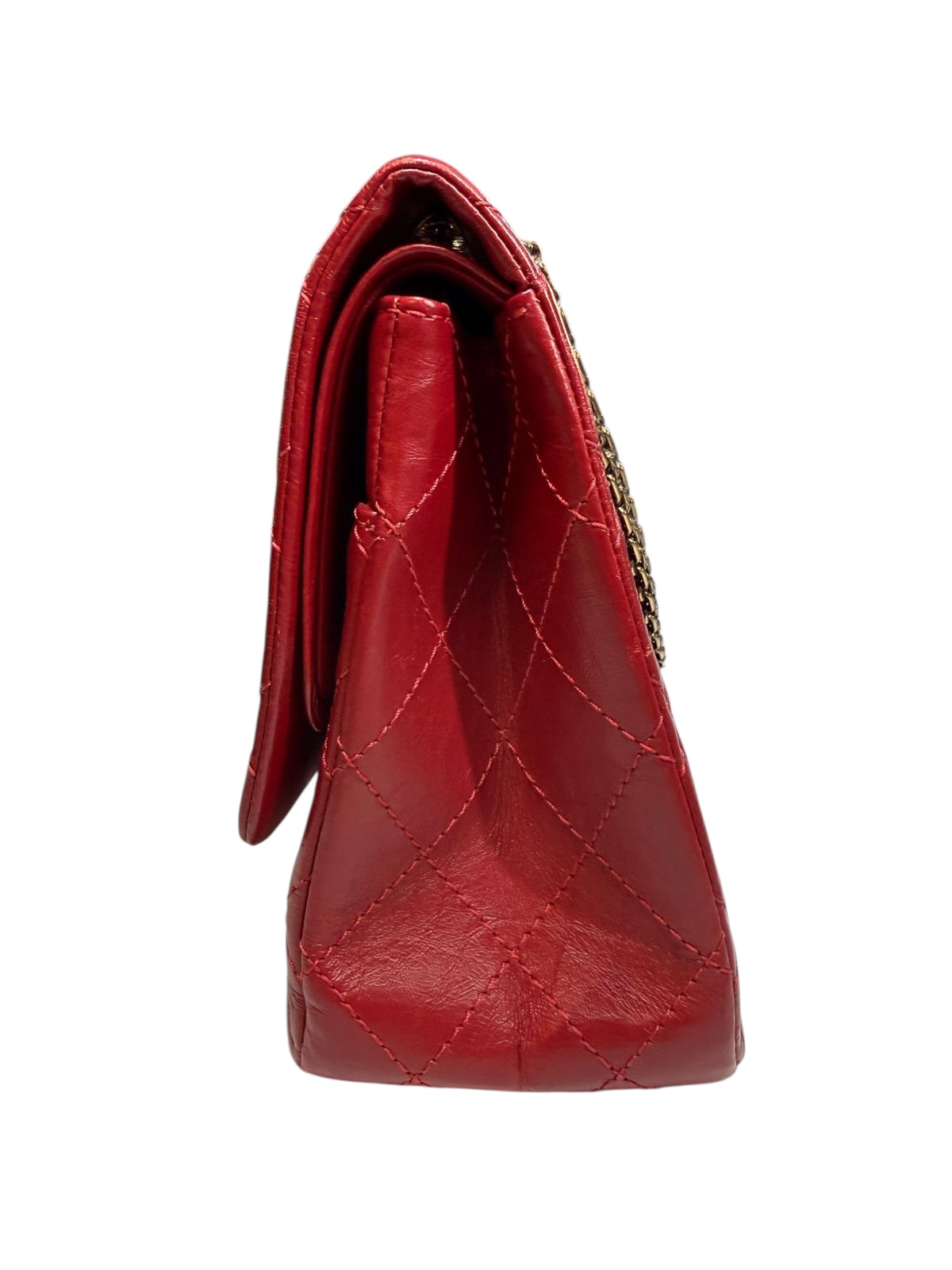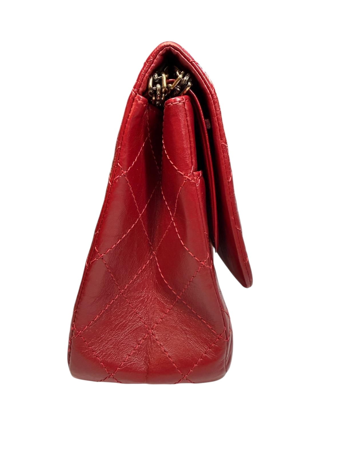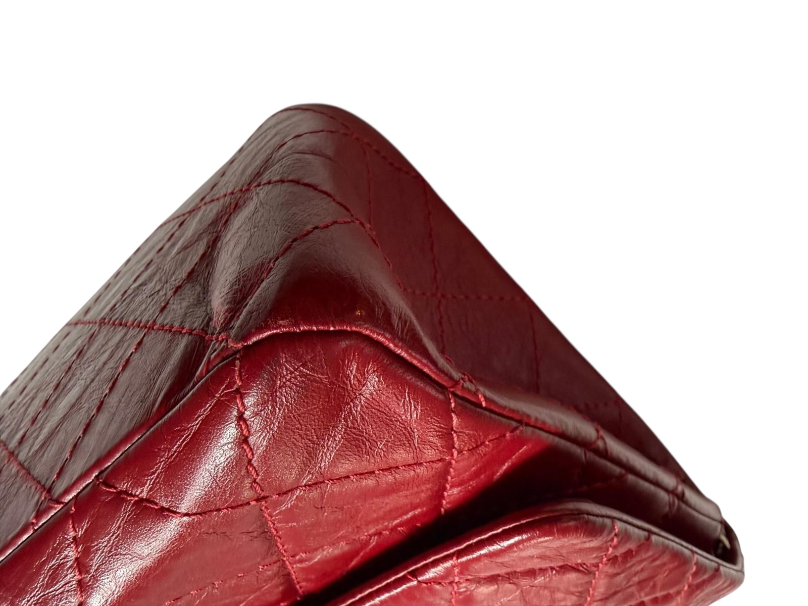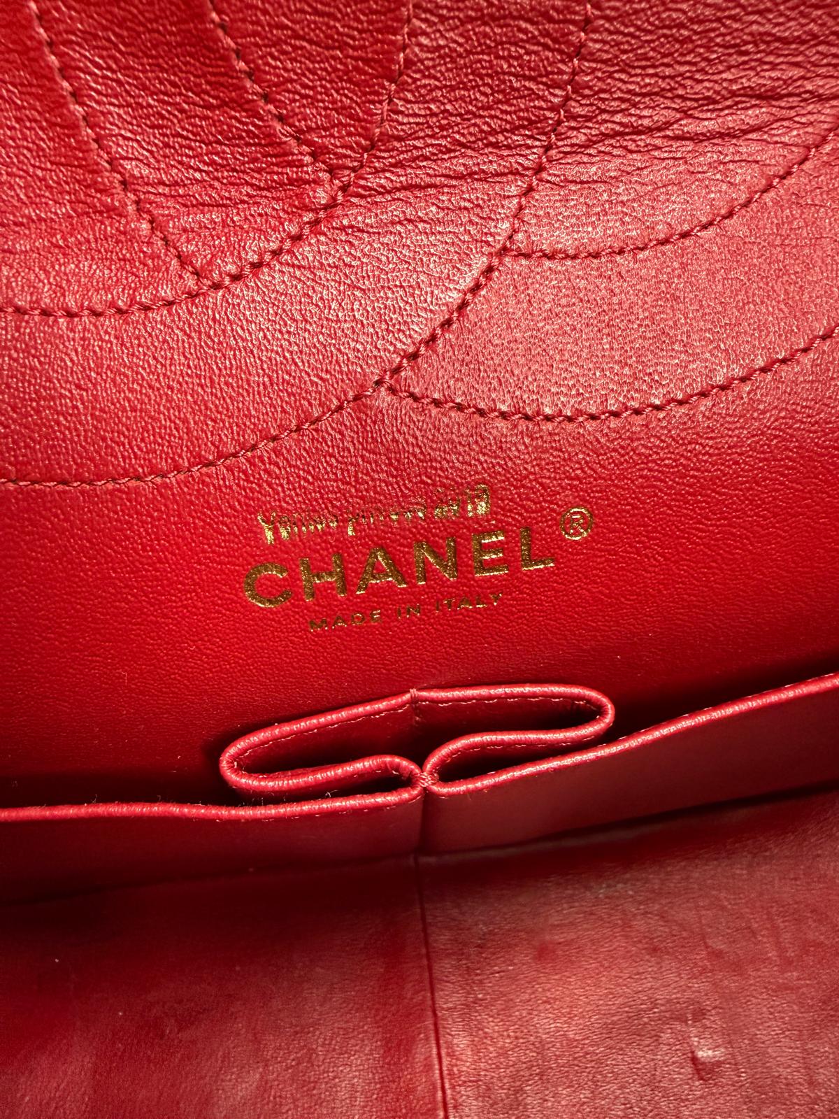 Le sac Chanel 2.55 est l'icône originelle de la Maison Chanel. Cette version en cuir de veau vieilli rouge capture l'essence du luxe intemporel avec son aspect légèrement froissé et sa patine sophistiquée. Le matelassage en losanges, réalisé avec une précision artisanale, donne au sac son relief et sa tenue légendaire.