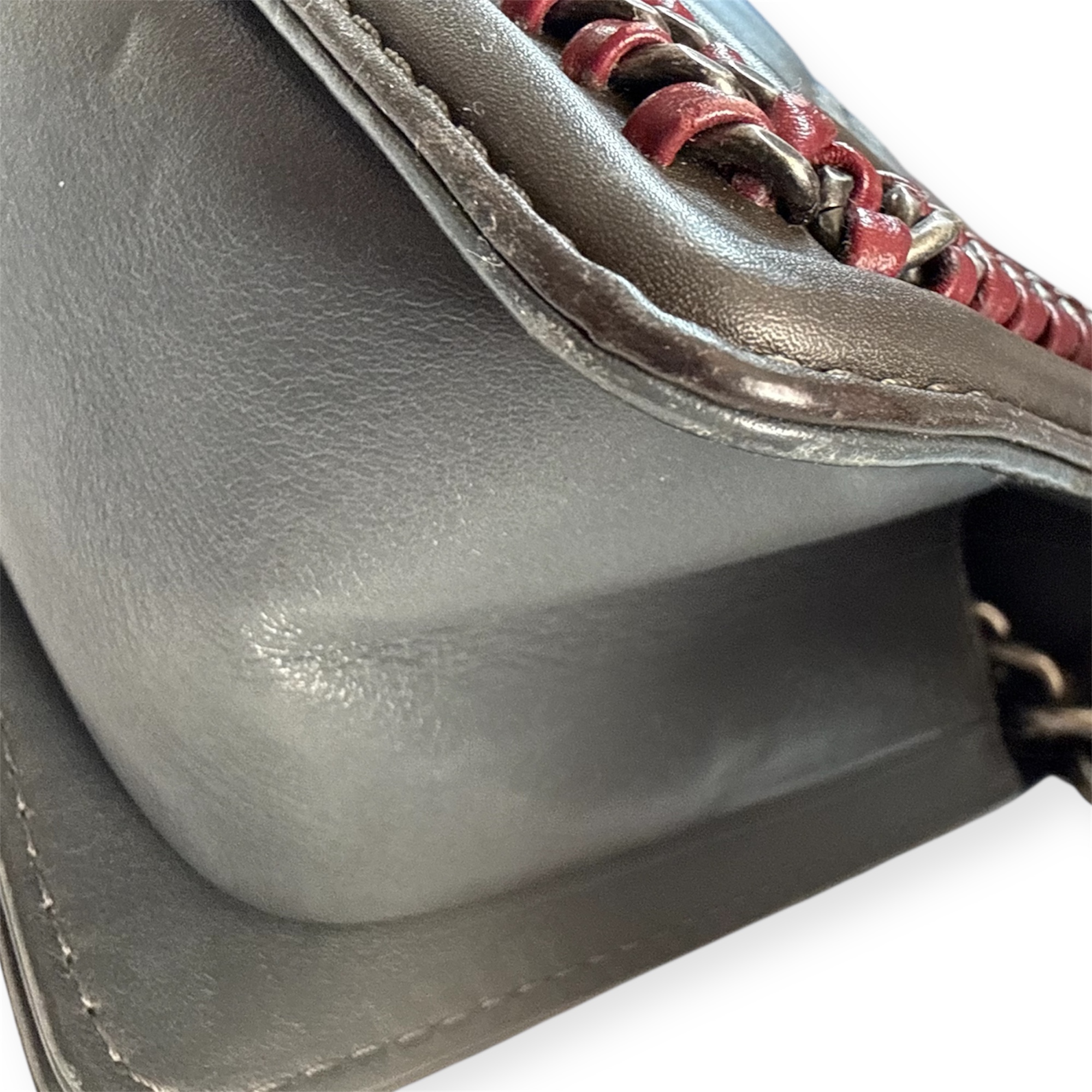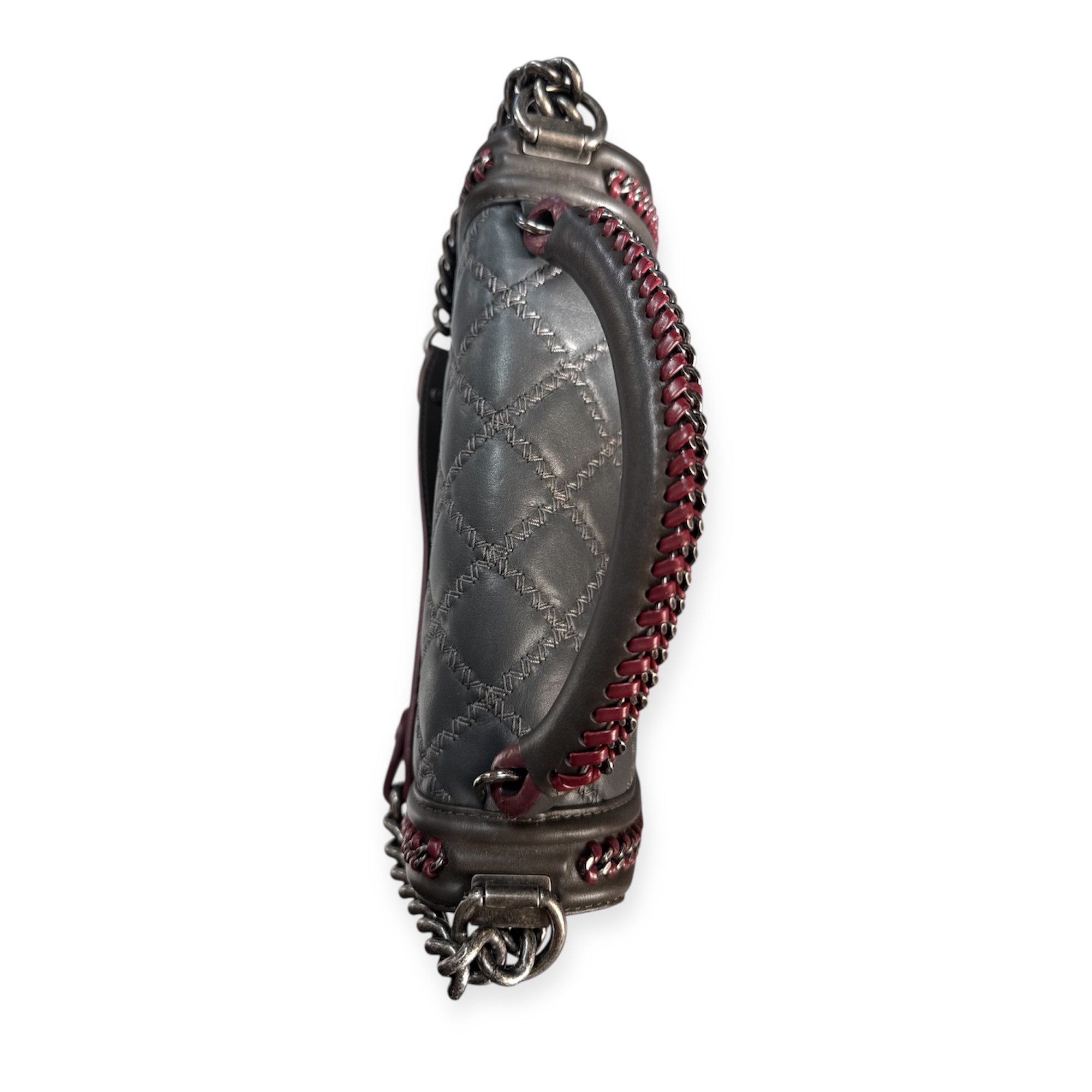 Confectionné en cuir matelassé dans une teinte gris profond, il présente le célèbre motif diamant qui apporte relief et sophistication à la surface du sac. Les bordures sont subtilement soulignées par une finition contrastée associée à une chaîne métallique décorative et du cuir bordeaux qui encadrent élégamment le rabat, accentuant le caractère contemporain du modèle.