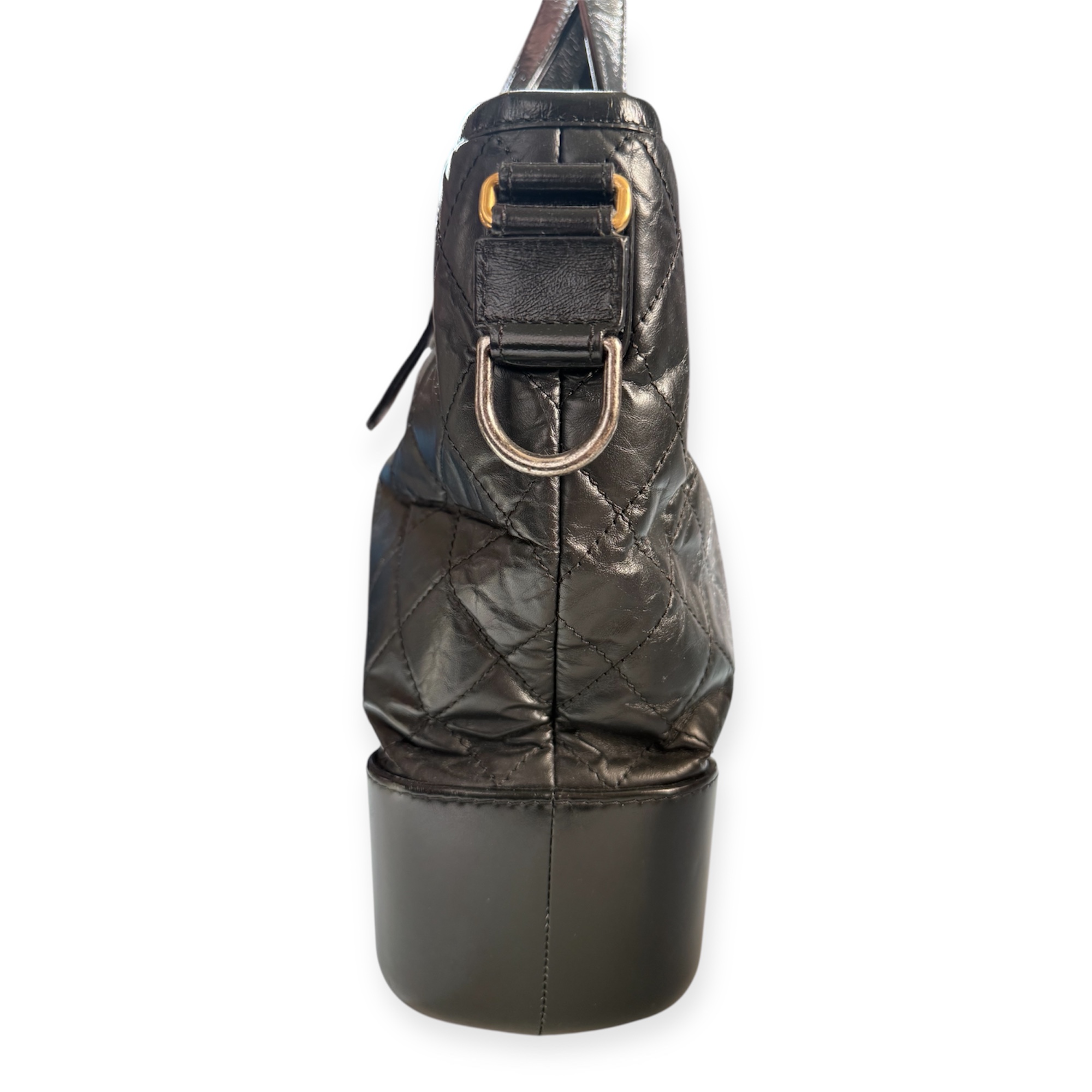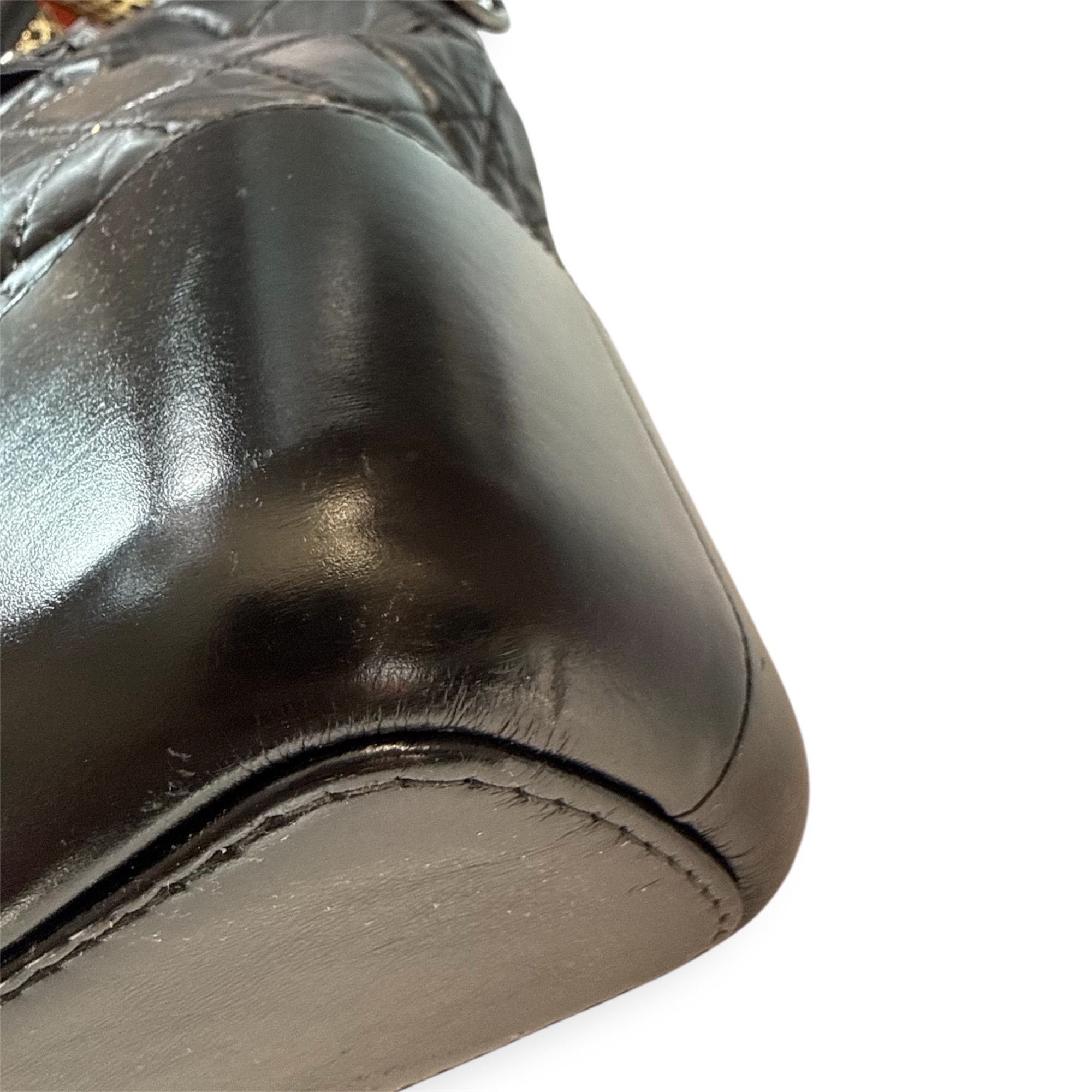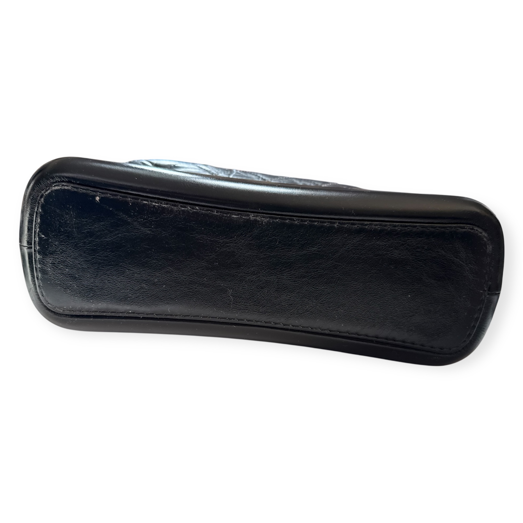 Confectionné en cuir noir, il présente le motif diamant signature de Chanel sur la partie supérieure, contrasté par une base en cuir lisse plus rigide. Cette construction hybride est l’une des signatures du modèle, mêlant souplesse et structure dans un équilibre unique.