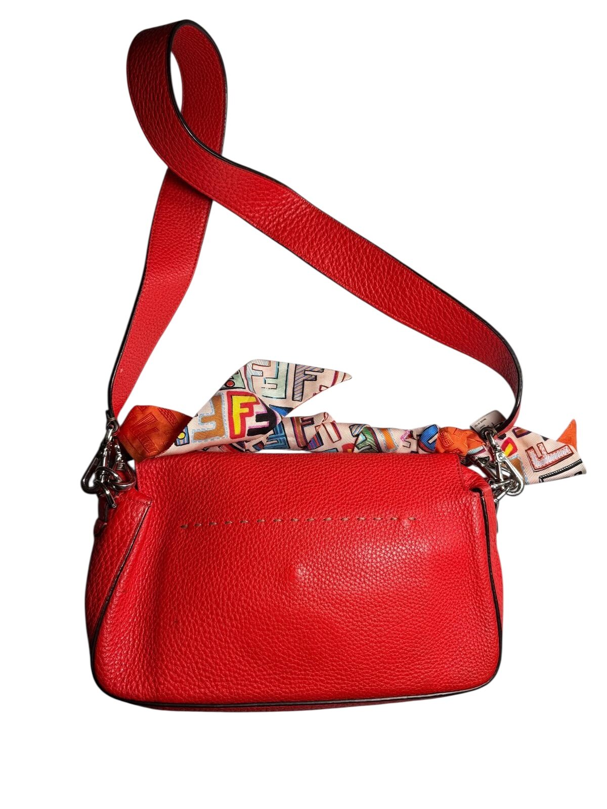 Le secret de ce modèle rouge réside dans son intérieur contrasté en turquoise, offrant une explosion de couleur dès l'ouverture. Il est orné du fermoir emblématique FF en métal argenté qui cache un bouton-pression magnétique. Polyvalent, il est doté d'une poignée et d'une bandoulière en cuir assortie, permettant un porté main, épaule ou croisé. Ce sac est l'équilibre parfait entre sobriété extérieure et audace intérieure, une pièce de collection pour les amatrices de détails exclusifs.