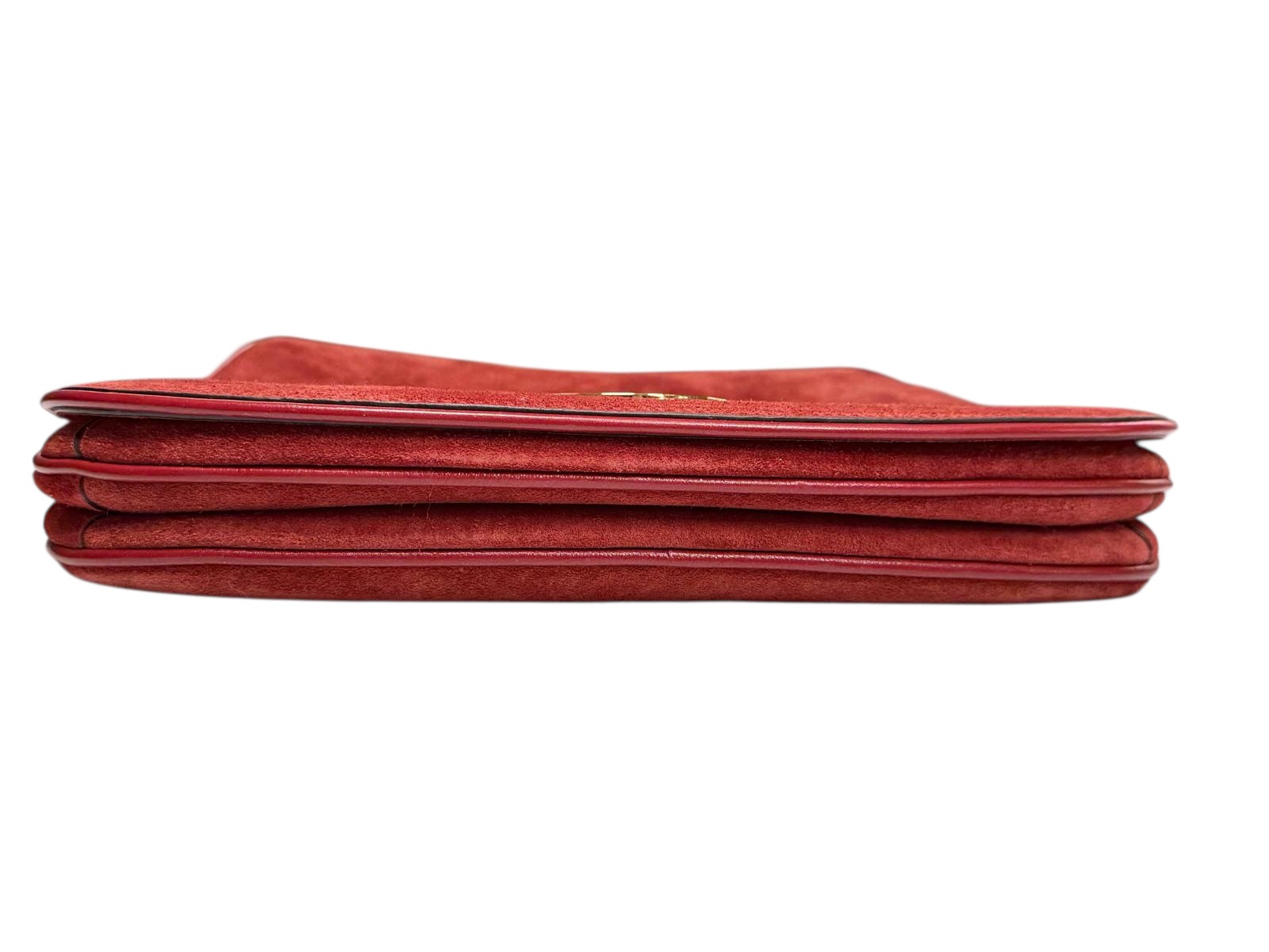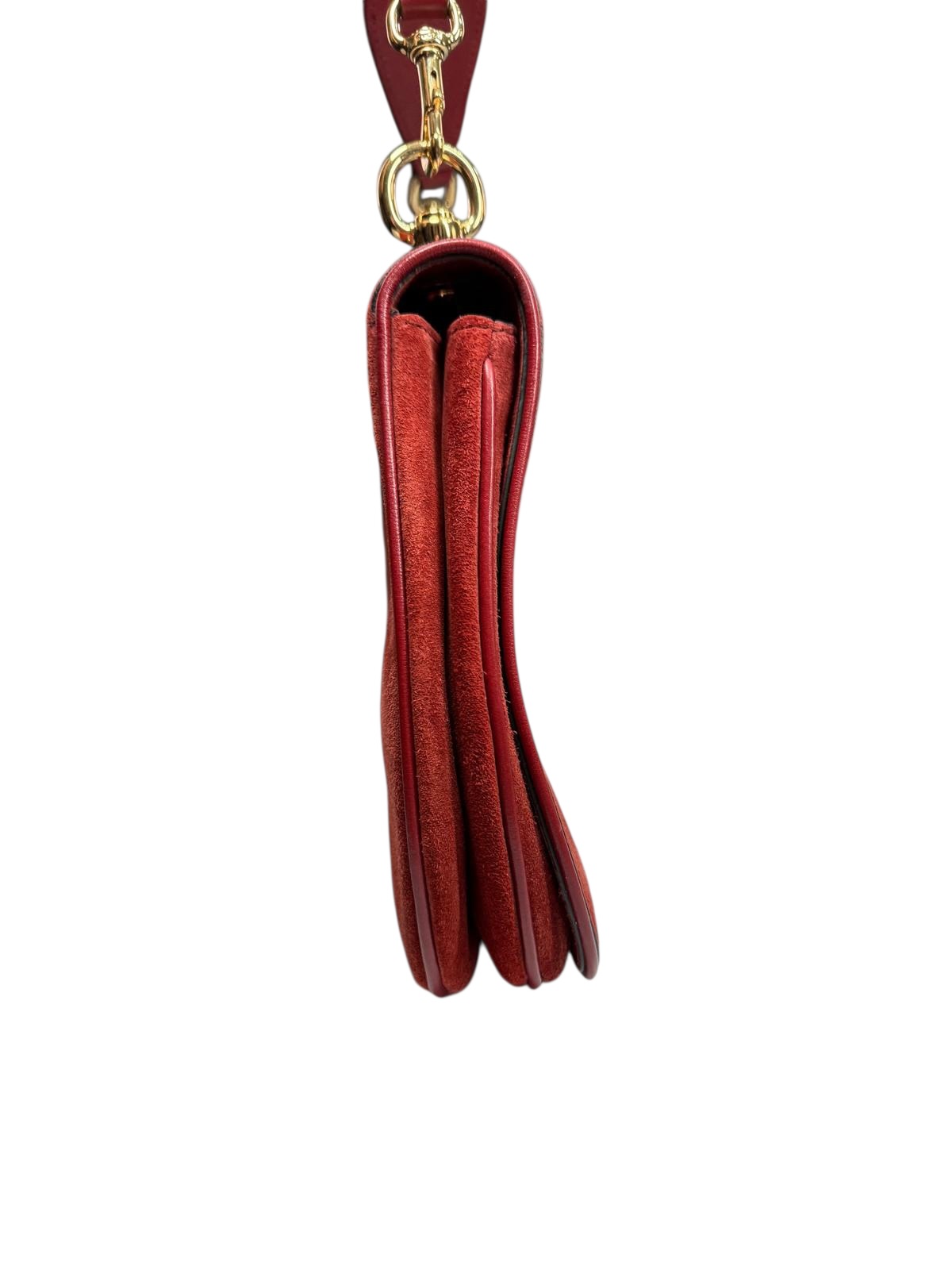 Présenté dans un daim bordeaux orangé, ce sac apporte une texture riche et une touche de couleur audacieuse à n'importe quelle tenue. Il est accompagné d'une bandoulière Web amovible réglable verte et jaune pour le modèle daim, permettant de passer d'un style porté épaule sophistiqué à un porté croisé plus décontracté et moderne.