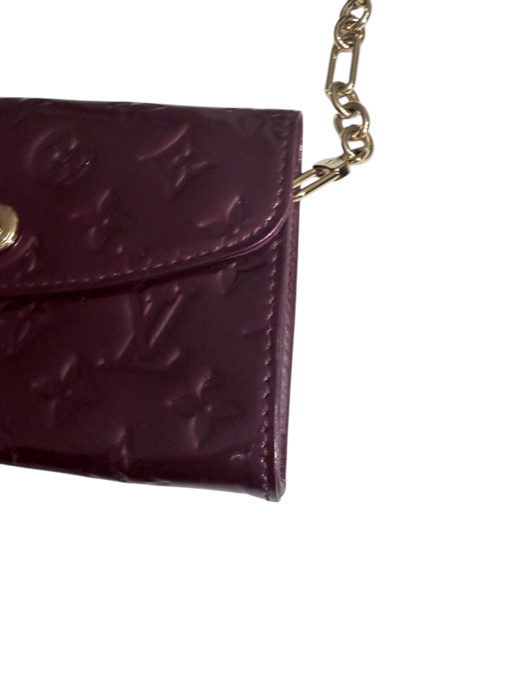 Ce sac pochette Louis Vuitton est une itération luxueuse de la pochette de soirée classique. Elle est confectionnée en cuir vernis violet, qui révèle subtilement le motif monogramme embossé sous une finition brillante miroir.