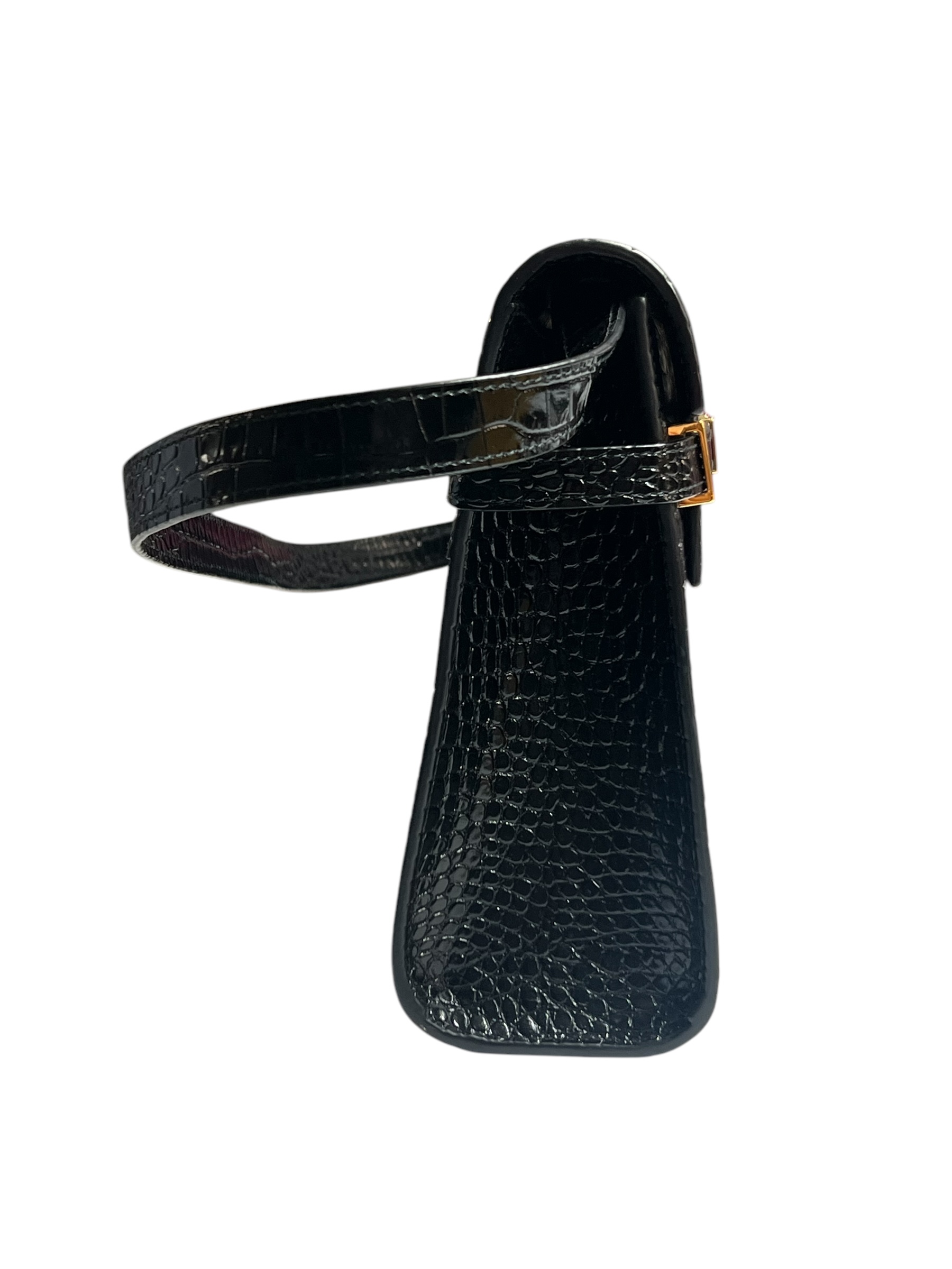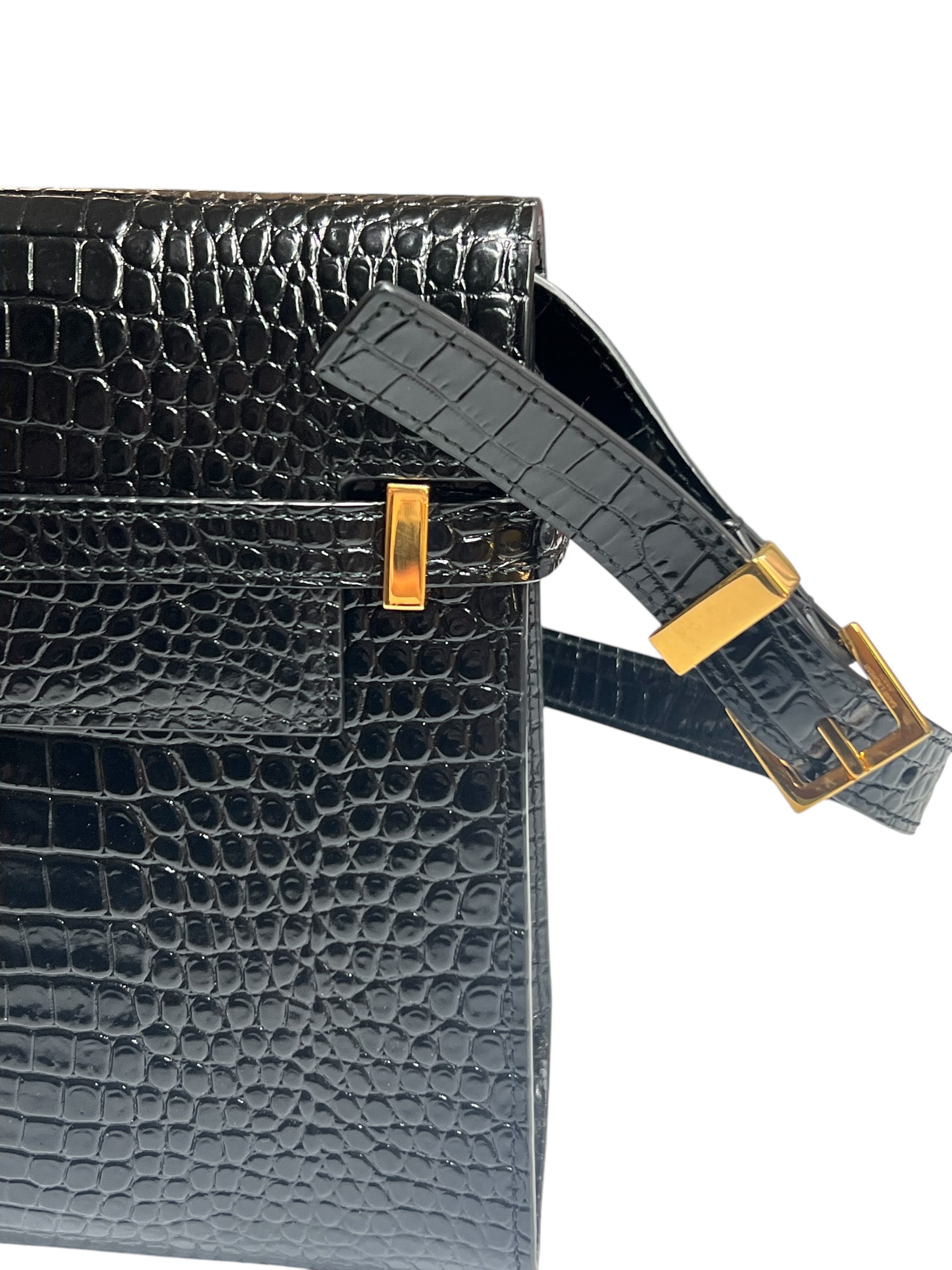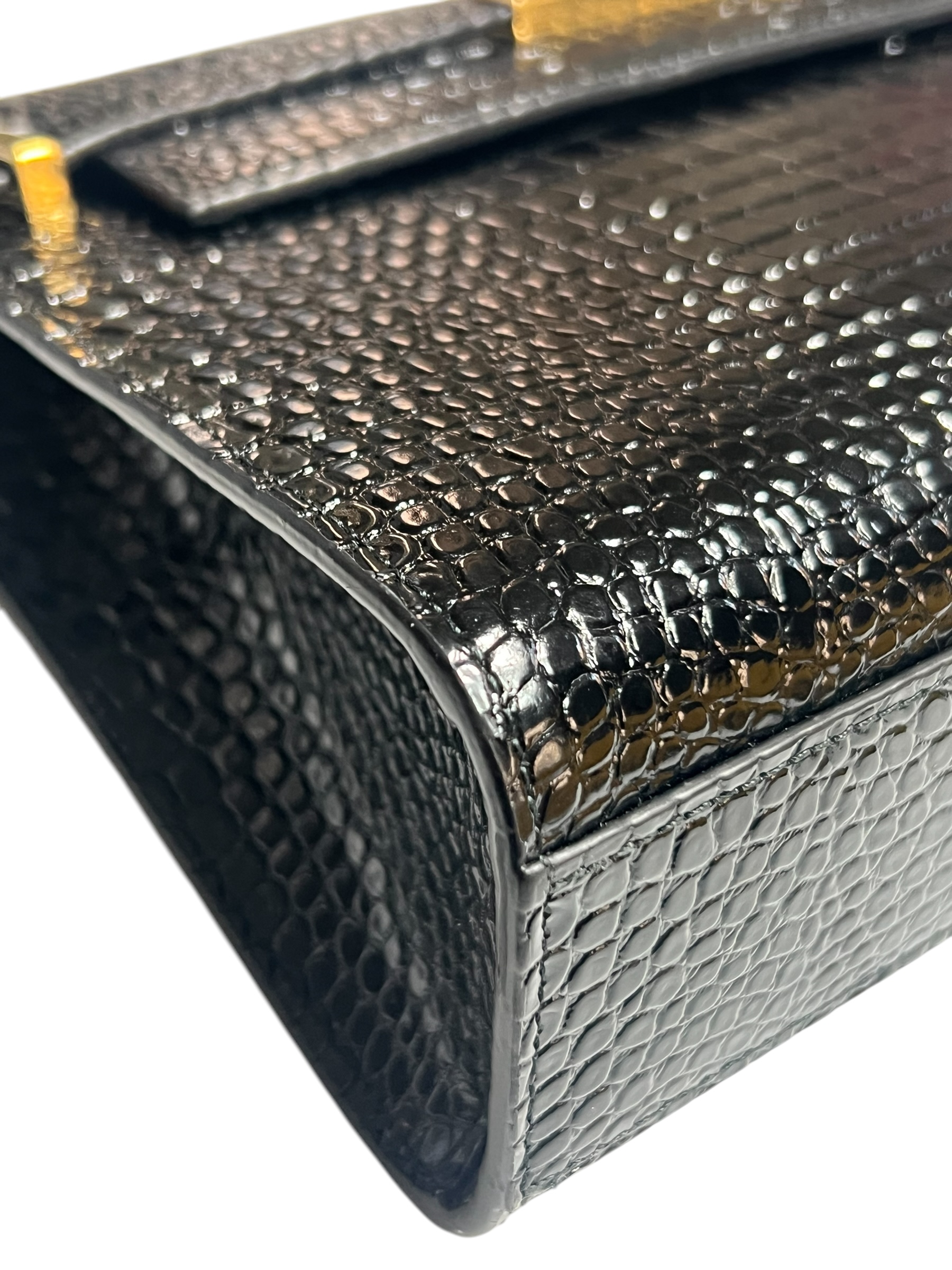 Ce sac Saint Laurent modèle Manhattan se distingue par sa silhouette rectangulaire épurée et son cuir noir embossé façon crocodile, qui lui confère une texture luxueuse et un caractère affirmé. Il est mis en valeur par un fermoir signature, élégamment ceinturé, en métal doré. C'est l'accessoire parfait pour un look de soirée sophistiqué, mais il peut aussi sublimer une tenue de jour avec une touche de luxe discret.