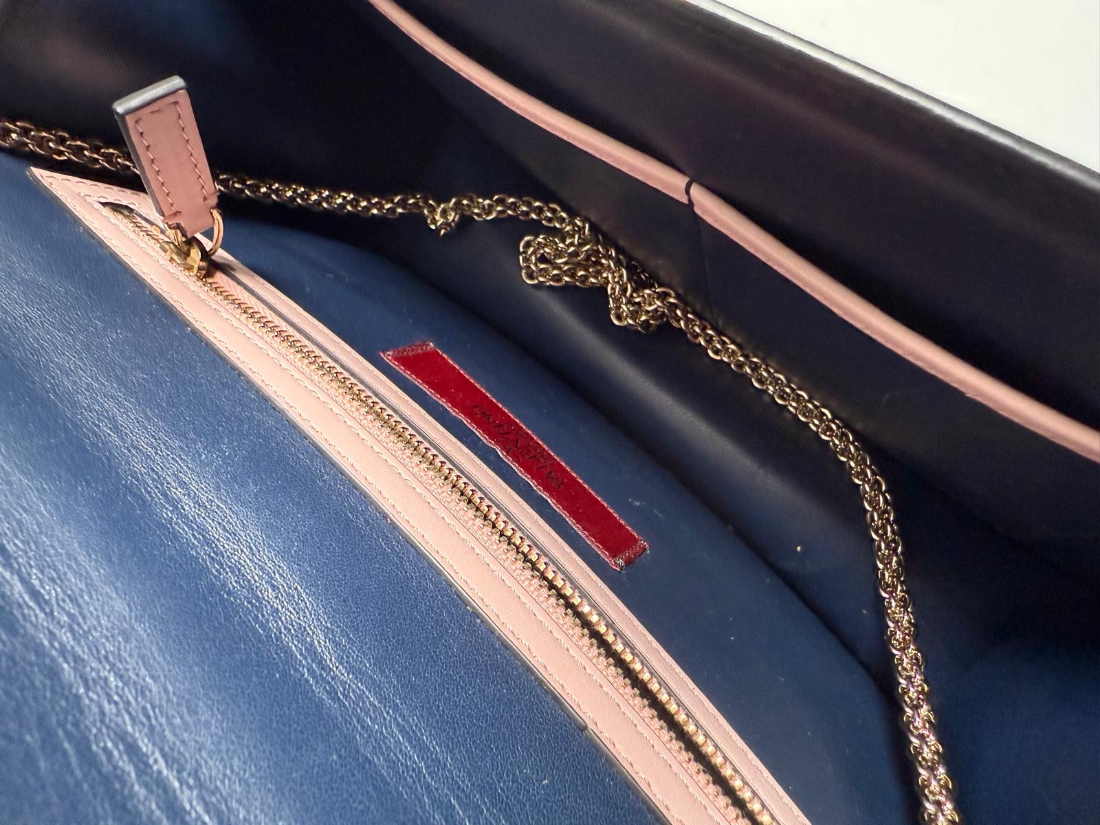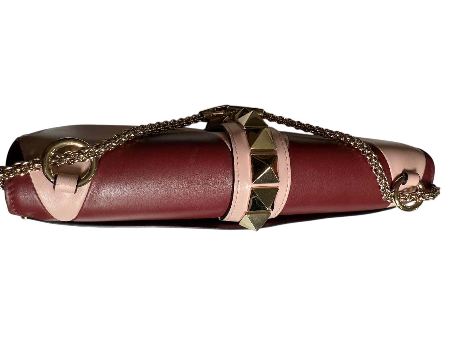 Le design est ponctué par les célèbres clous pyramidaux "Rockstud" en bijouterie champagne surdimensionnés qui ornent le fermoir à pression central, ainsi que par une bandoulière champagne fine et élégante. Ce sac allie l'esthétique punk-chic de Valentino à une palette de couleurs féminines et sophistiquées, en faisant l'accessoire idéal pour structurer une tenue monochrome ou rehausser un look de soirée.