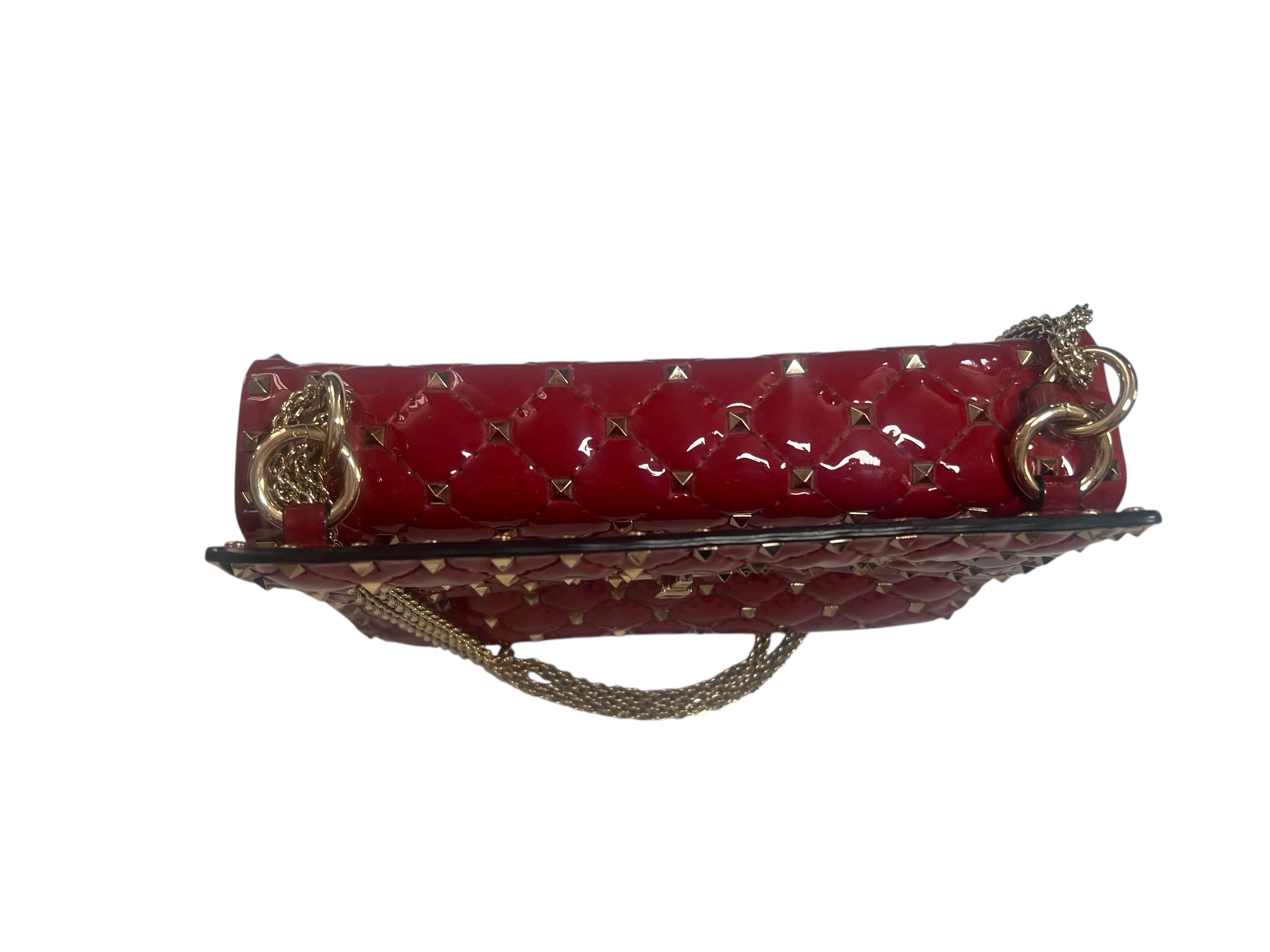 Adoptez un style audacieux et élégant avec ce sac Valentino. Parfait pour une soirée, il allie le matelassage classique à des détails de la marque pour un look unique. Ce sac est confectionné dans un cuir rouge verni, avec des surpiqûres en forme de losanges. Il est orné de petits clous "Rockstud" bijouterie champagne, sur les surpiqûres et sur les bords du sac. Ce sac est polyvalent, avec la possibilité d'être porté à l'épaule ou en bandoulière.