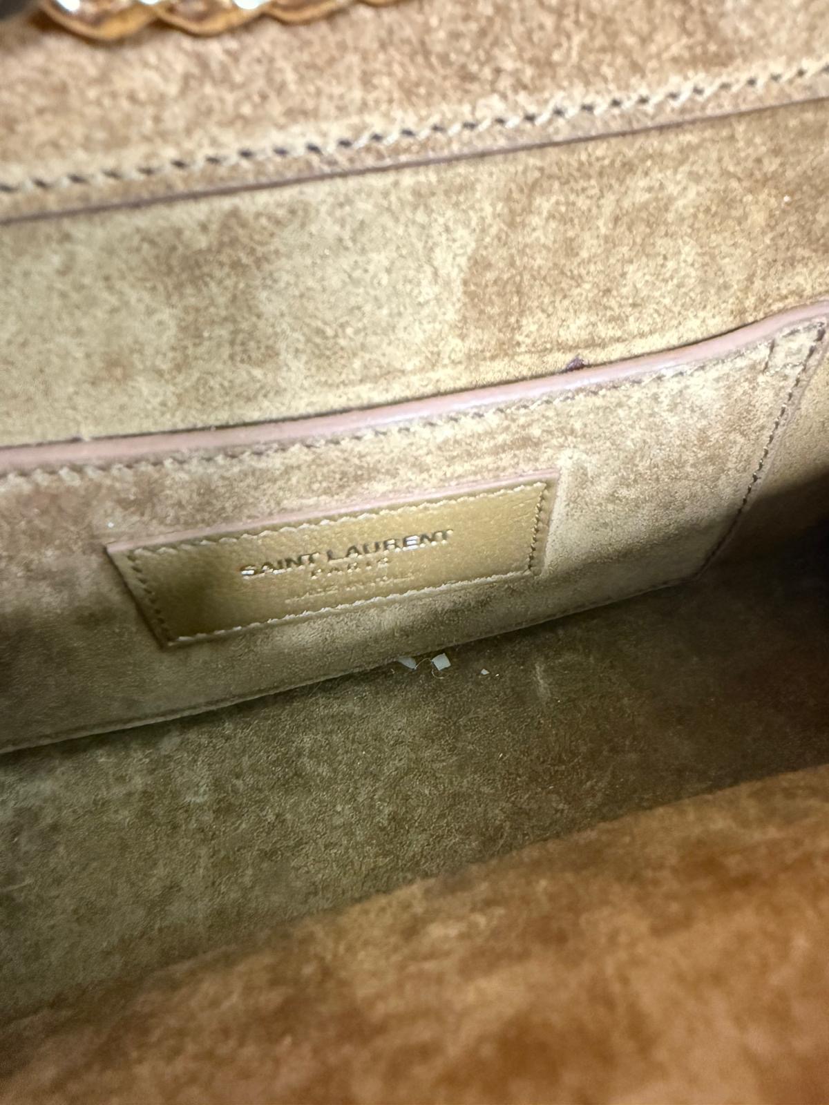 Le design structuré par un rabat en pointe est orné de l'emblématique logo YSL entrelacé en métal doré au centre. Sa bandoulière coulissante mélangeant chaîne gourmette et empiècement en cuir permet un porté épaule ou croisé confortable.