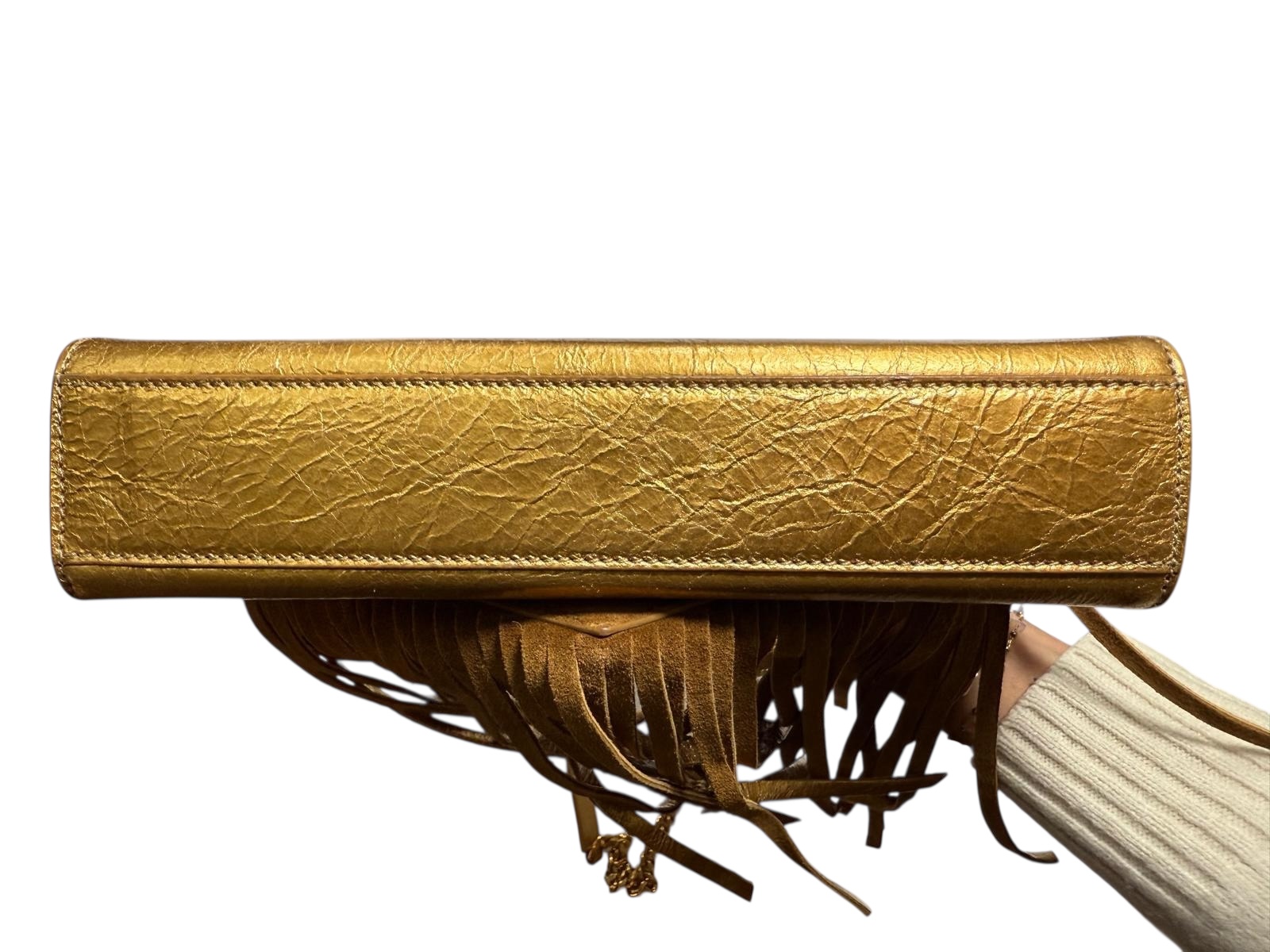 Ce sac Yves Saint Laurent est une pièce spectaculaire qui capture l'essence du style bohème-chic signature de la maison. Confectionné dans un cuir souple à la finition métallisée or vieilli, il se distingue par ses longues franges en cuir qui apportent un mouvement fluide et dynamique à chaque pas.