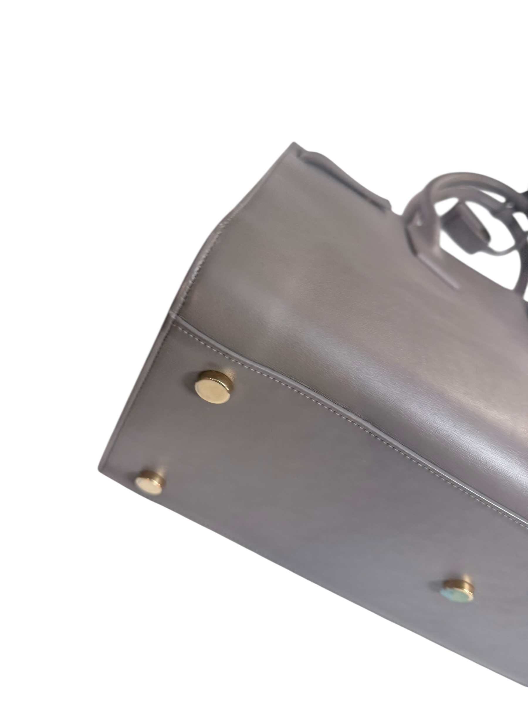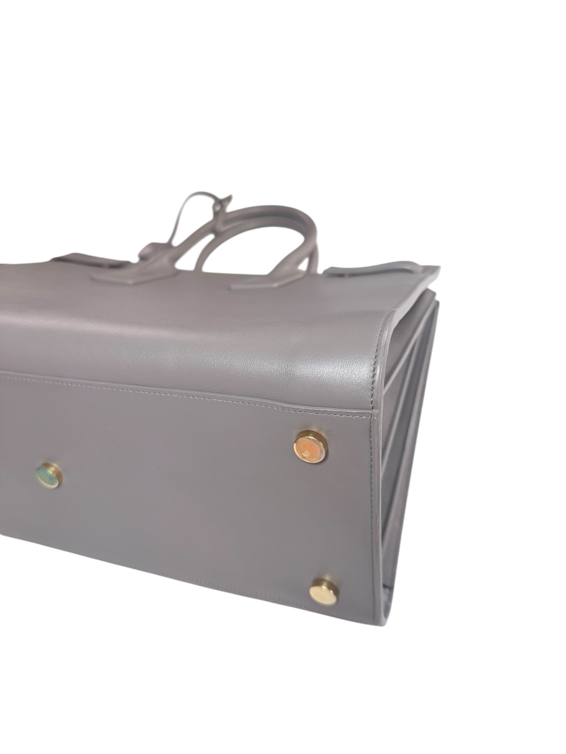 Sa couleur grise est une alternative sophistiquée au noir, offrant une neutralité qui s'adapte à toutes les saisons. Le design se caractérise par ses poignées tubulaires rigides, ses soufflets latéraux en accordeau compressés, et un marquage "Saint Laurent Paris" discret en lettres dorés sur le devant. L'intérieur spacieux et les lignes épurées en font le sac "business" par excellence, alliant autorité stylistique et fonctionnalité