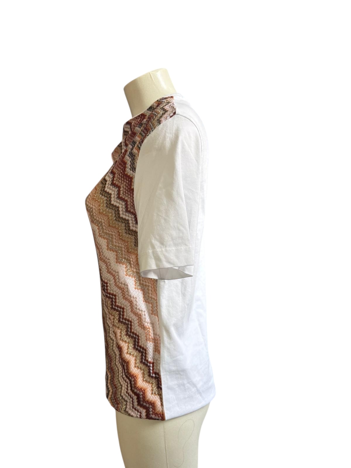 Ce T-Shirt Missoni est une pièce emblématique qui illustre parfaitement l'héritage chromatique et graphique de la Maison italienne. Il se distingue par son plastron central arborant le célèbre motif "Ziz-Zag", décliné dans une palette chaleureuse de nuances terreuses : terracotta, beige, ocre...