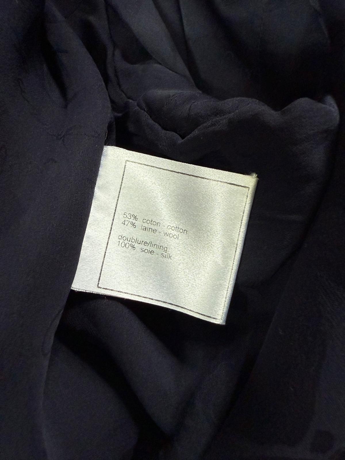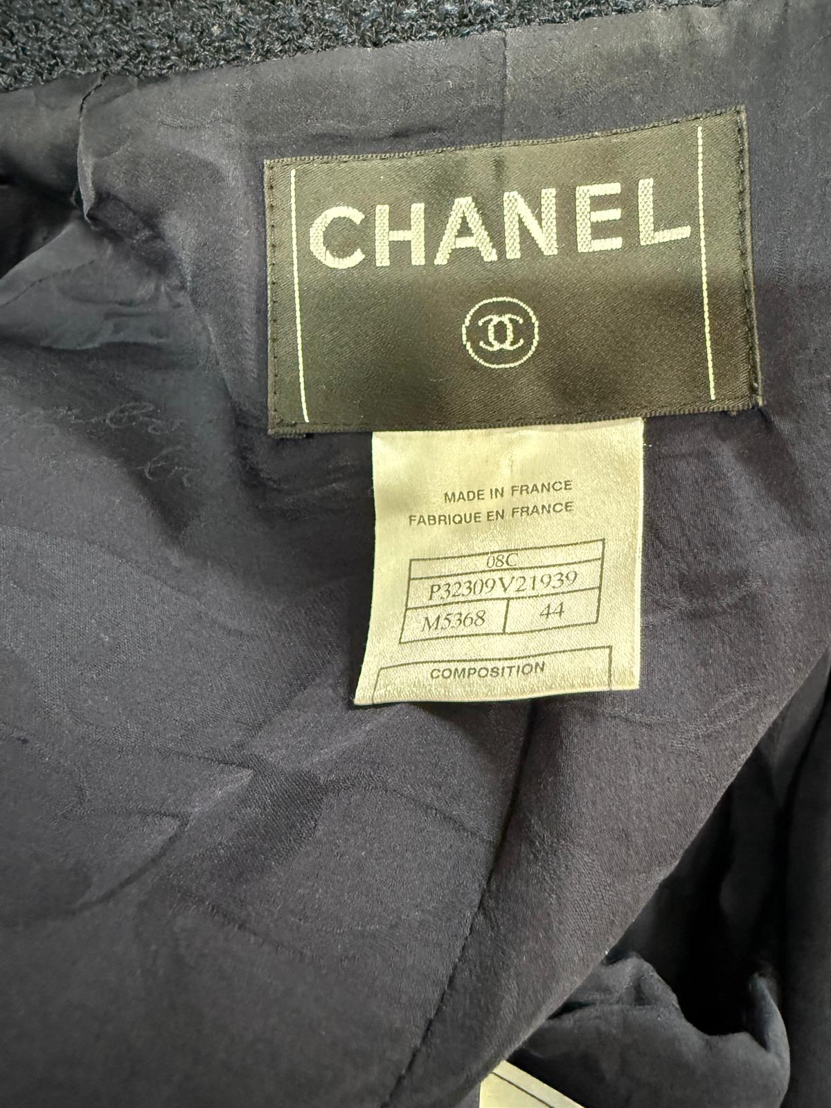 Cette veste Chanel est la fusion parfaite entre le confort d'un cardigan et l'élégance d'un trench-coat. Cette superbe veste Chanel est confectionnée dans une maille texturée bleu marine et reprend tous les codes du trench classique : double boutonnage, ceinture et épaulettes. Entièrement réalisée dans une maille de haute qualité, dense et texturée, d'une profonde couleur bleu marine, cette veste offre une aisance et une douceur exceptionnelles. Une pièce de mi-saison chic, confortable et incroyablement polyvalente.